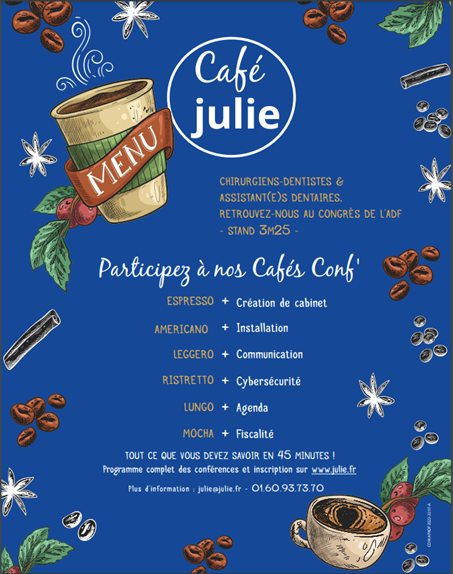 Sur notre stand (3M25), nous proposons aussi des temps forts informatifs sous forme de « Cafés conf’ ». Création de cabinet, fiscalité, communication vers les patients, cybersécurité, agenda et autres thèmes inspirants pour vous guider au quotidien dans votre activité comme nous le faisons avec nos solutions digitales.