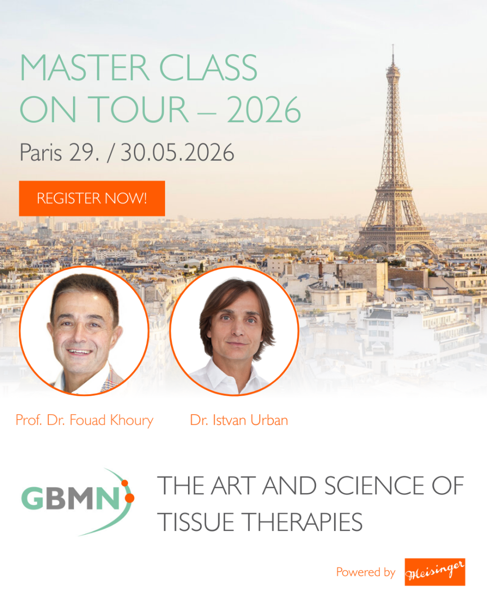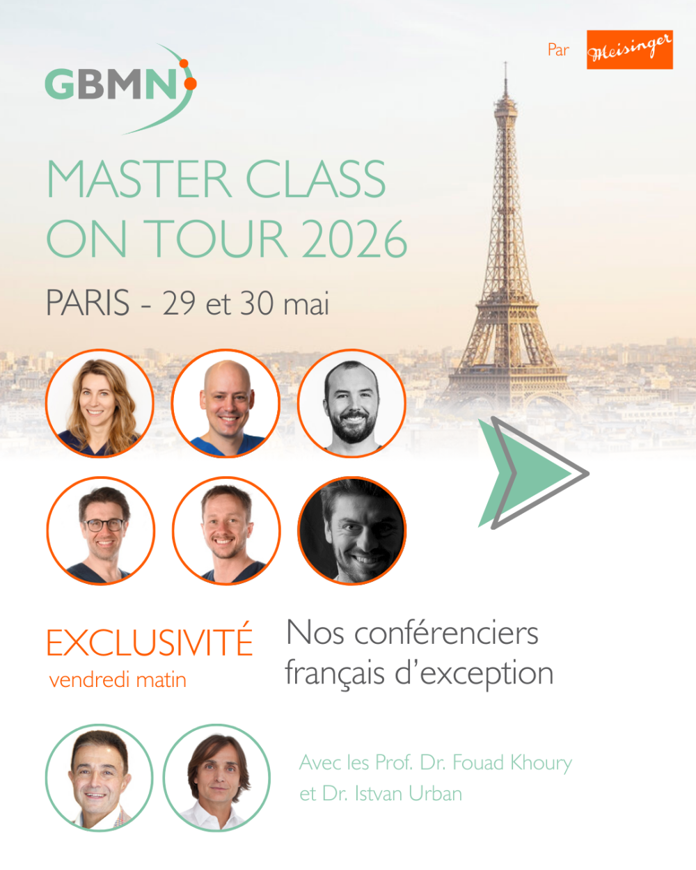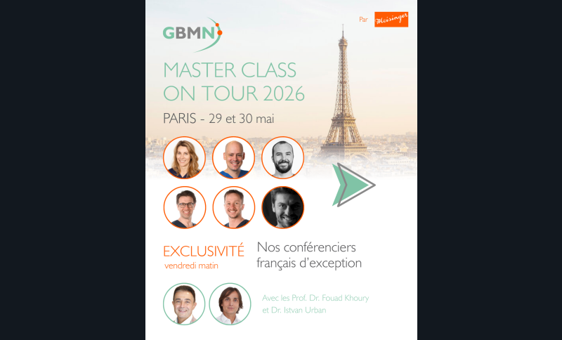 La GBMN – Master Class on Tour 2026 réunira à Paris des professionnels de la chirurgie dentaire autour d’un programme scientifique intensif dédié à la régénération osseuse et à l’implantologie. L’événement sera notamment l’occasion de voir le Prof. Dr. Fouad Khoury et le Dr. Istvan Urban, figures de référence internationales dans le domaine de la reconstruction osseuse, accompagnés de leurs représentant(e)s français(es).