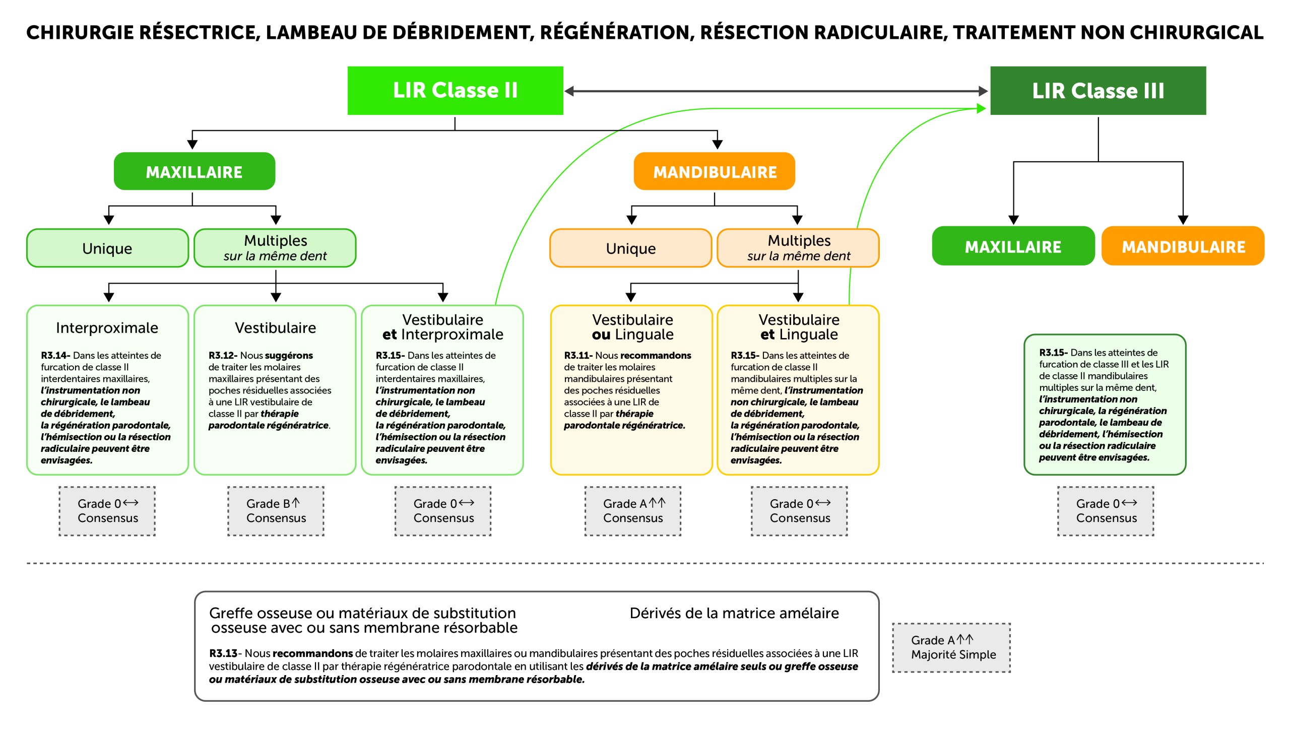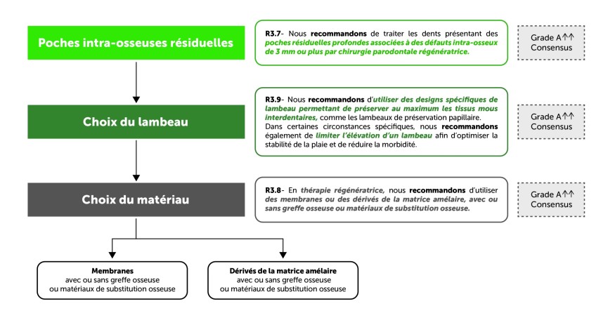 Figure 4. Synthèse de trois recommandations établies pour le traitement régénérateur des défauts intra-osseux associés à des poches résiduelles (au cours de l’étape 3 du traitement parodontal). Pour rappel, une poche intra-osseuse se définit par le fait que le fond de la poche se situe apicalement par rapport à la crête osseuse résiduelle adjacente. La poche est dite profonde quand elle est ≥ 6 mm par rapport au niveau gingival. Dans cette poche intra-osseuse, la lésion intra-osseuse est dite profonde quand elle est ≥ 3 mm par rapport au niveau osseux marginal adjacent. Le traitement régénérateur de ces lésions intra-osseuses profondes, avec des designs de lambeaux préservant au maximum les tissus, se traduit par de meilleurs résultats que la chirurgie avec lambeau d’accès.