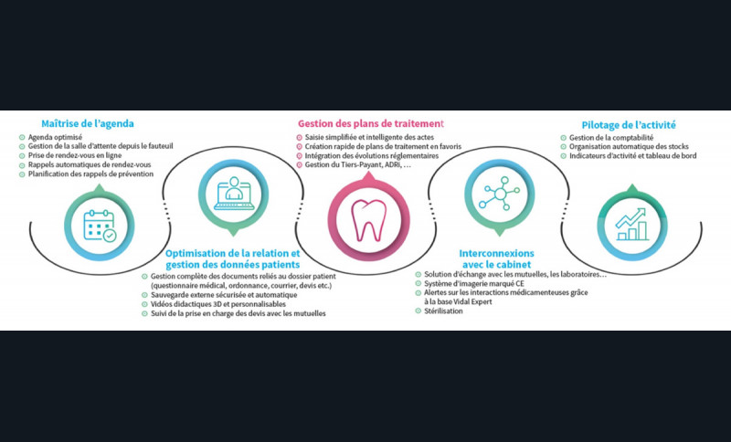 D’autres fonctionnalités concernant la gestion de l’agenda (rappel de rendez-vous automatique, prise de rendez-vous en ligne…), la digitalisation de la relation patient (dossier patient numérique, supports didactiques pour faciliter la compréhension des traitements, suivi de prises en charge et des devis…), ou encore le pilotage du cabinet (comptabilité, stocks, stérilisation, indicateurs d’activité…), sont les clés de l’optimisation et de la performance de votre cabinet dentaire.