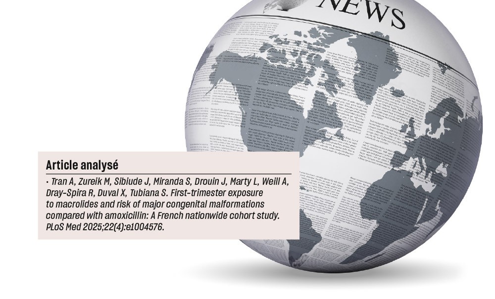 Les macrolides constituent une classe d’antibiotiques fréquemment prescrits pour le traitement des infections bactériennes au cours de la grossesse. En France, plus de 5 % des grossesses ont été exposées à au moins un macrolide en 2019. Aux États-Unis, 4,4 % des grossesses aboutissant à une naissance viable chez les bénéficiaires d’une assurance privée ont été exposées à l’azithromycine, un antibiotique de la classe des macrolides, durant le premier trimestre entre 2011 et 2020.