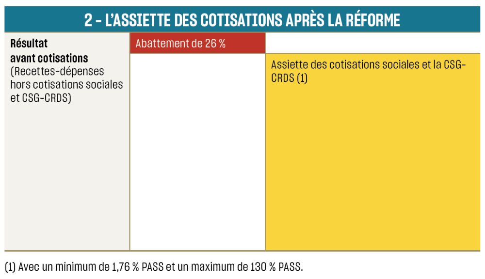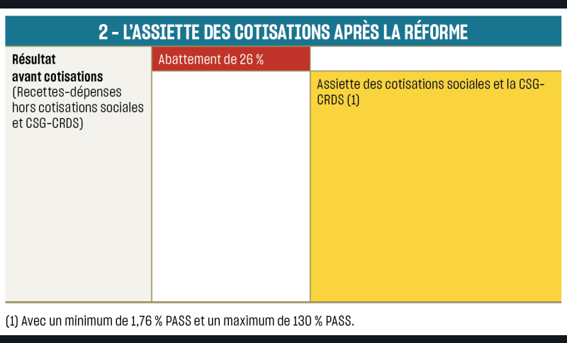 Les cotisations sociales seront calculées sur la base des recettes, diminuées des dépenses d’exploitation et sans la déduction des cotisations sociales. Un abattement forfaitaire de 26 % sera ensuite appliqué. Cet abattement remplacera la déduction des cotisations.