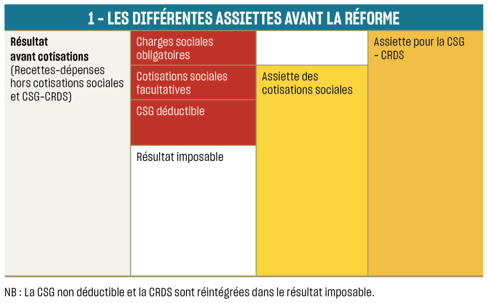 La réforme prévoit de simplifier la détermination de l’assiette des cotisations, en supprimant les calculs circulaires et en ne retenant qu’une seule assiette pour l’ensemble des cotisations sociales et pour la CSG-CRDS (fig. 2). Avant la réforme, la base de calcul de la CSG-CRDS des indépendants était plus élevée que la base de calcul des cotisations sociales (fig. 1).