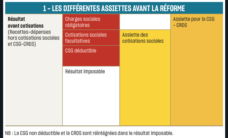 Actuellement, les travailleurs indépendants (artisans, commerçants, professionnels libéraux, avocats, travailleurs non salariés agricoles) cotisent sur deux assiettes distinctes en fonction de la nature des prélèvements :