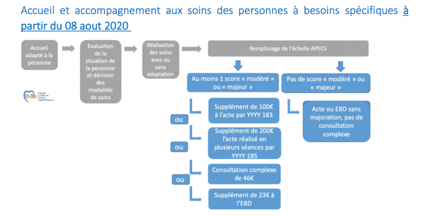 Ces mesures tarifaires s’appliquent à tous les patients atteints « d’handicap physique, sensoriel, mental, cognitif ou psychique sévère, d’un polyhandicap et possédant au moins un score modéré ou majeur lors du remplissage de l’échelle des Adaptations pour une prise en charge spécifique en odontologie (échelle APECS) » qui évalue le « comportement et la coopération » des patients au cours de la séance de soins. Cette grille, à télécharger ici 👉 echelle_apecs, est à remplir après la séance de soins.