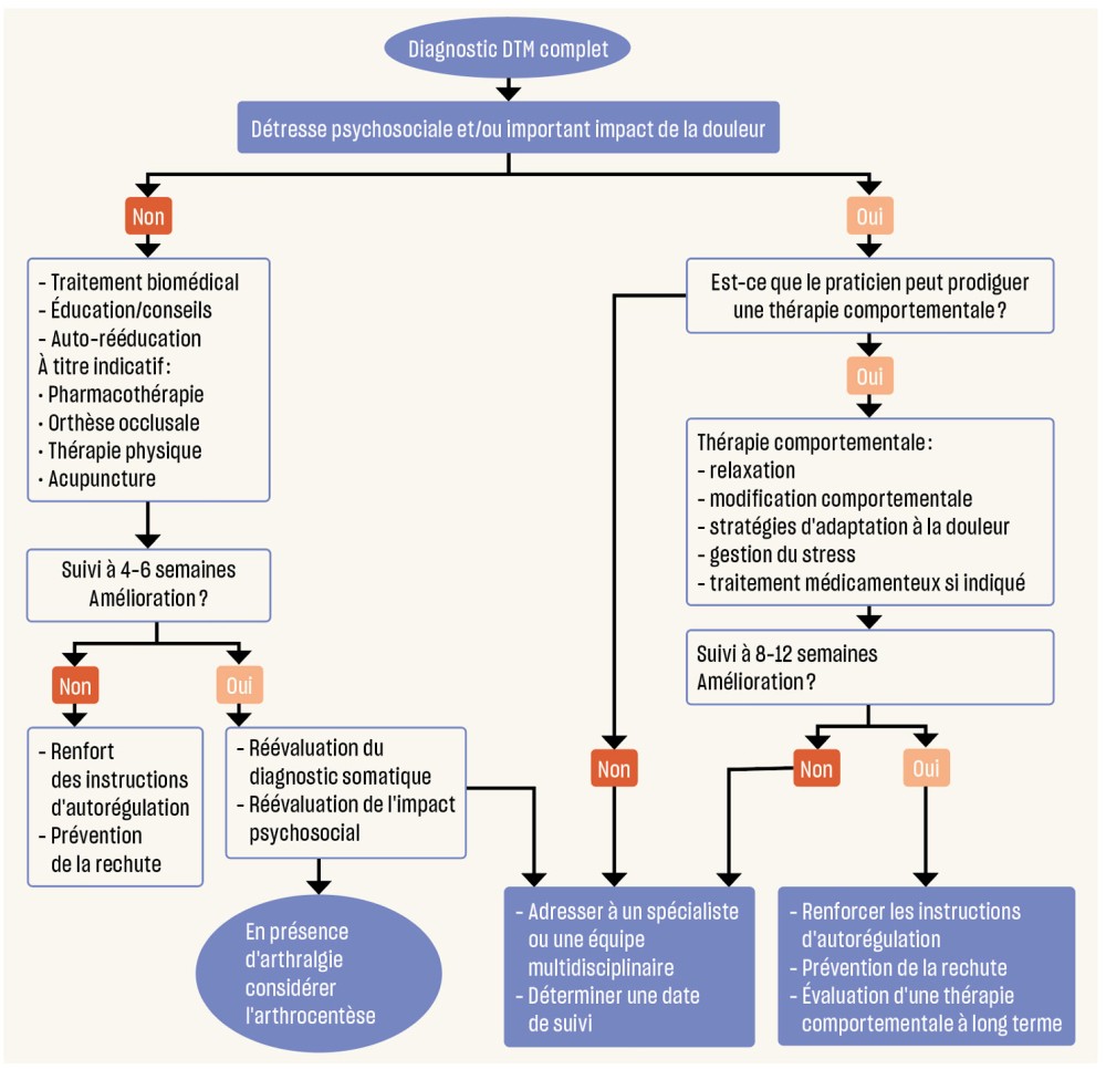 Le rôle du chirurgien-dentiste sera donc multiple aux différentes étapes de l’émergence des DTM : il sera tout d’abord de faire un diagnostic différentiel avec une étiologie dentaire ou parodontale, de dépister les signes évocateurs d’un DTM, puis d’adresser au spécialiste dont le champ de compétence permettra une prise en charge optimale. à ce titre, les questionnaires courts d’aide au dépistage et les critères diagnostiques des principales co-occurrences seront présentés ainsi que les recommandations de prises en charge actuelles des DTM [4] (fig. 2).