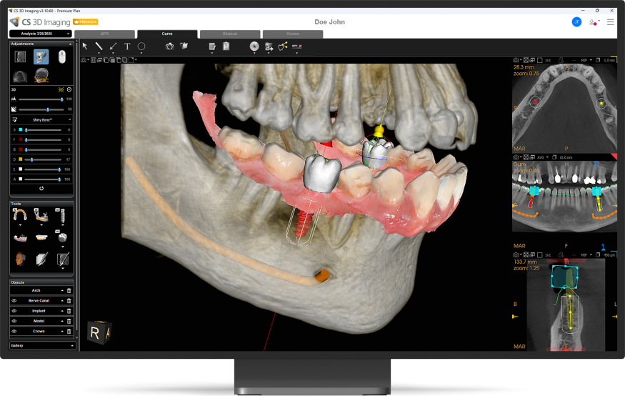 CS 3D Imaging Premium s’appuie sur une intelligence artificielle pour automatiser les taches chronophages afin que les praticiens gagnent du temps dans leurs planifications implantaires. Une fois que le logiciel a fusionné un CBCT avec les empreintes numériques, le praticien peut lancer la fonction AI Auto Implant, qui identifie et numérote automatiquement les dents. Après avoir sélectionné un implant dans la bibliothèque numérique de plus de 100 fabricants, le logiciel calcule la position de la couronne ainsi que les dimensions et la position de l’implant virtuel.