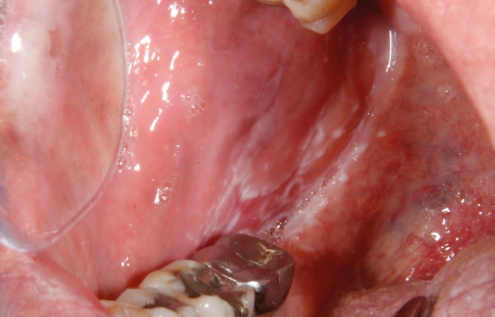 À l’interrogatoire, le patient affirme qu’il a des difficultés à maintenir une hygiène bucco-dentaire satisfaisante du fait des douleurs, et n’a pas pu consulter son chirurgien-dentiste pour son détartrage annuel en raison de la crise sanitaire en cours. L’examen clinique révèle une parodontite chronique (stade 3) généralisée et des lésions jugales (fig. 1 et 2), labiales (fig. 3) et gingivales (fig. 4) érythémateuses et kératosiques. Les lésions kératosiques jugales sont de type réticulé (fig. 1 et 2) ; les lésions kératosiques labiales sont associées à de petites érosions (fig. 3) ; les lésions palatines à des ulcérations (fig. 5). La langue présente une lésion blanche en « tache de bougie » (fig. 6) ; la muqueuse du plancher buccale est saine (fig. 7). Le signe de la pince est négatif. Le patient n’est pas porteur de prothèse dentaire malgré un édentement de moyenne étendue. Aucune lésion cutanée ou génitale n’est rapportée par le patient.