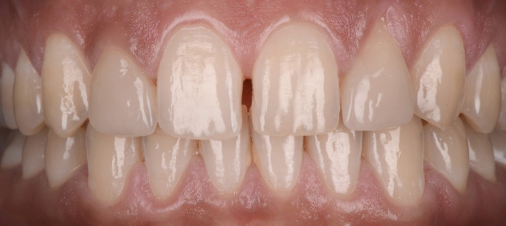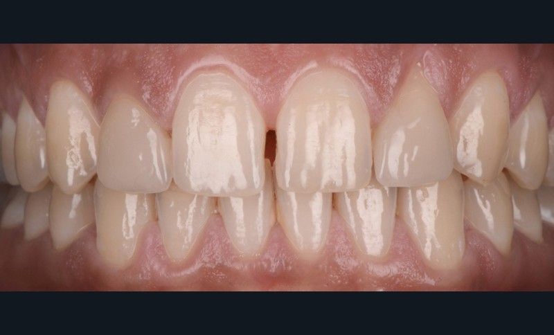 Une patiente est adressée par un orthodontiste pour des doléances esthétiques liées à son diastème. Elle rapporte avoir déjà eu un traitement orthodontique avec une contention fixe, mais celle-ci s’est fracturée et le diastème s’est rouvert.
