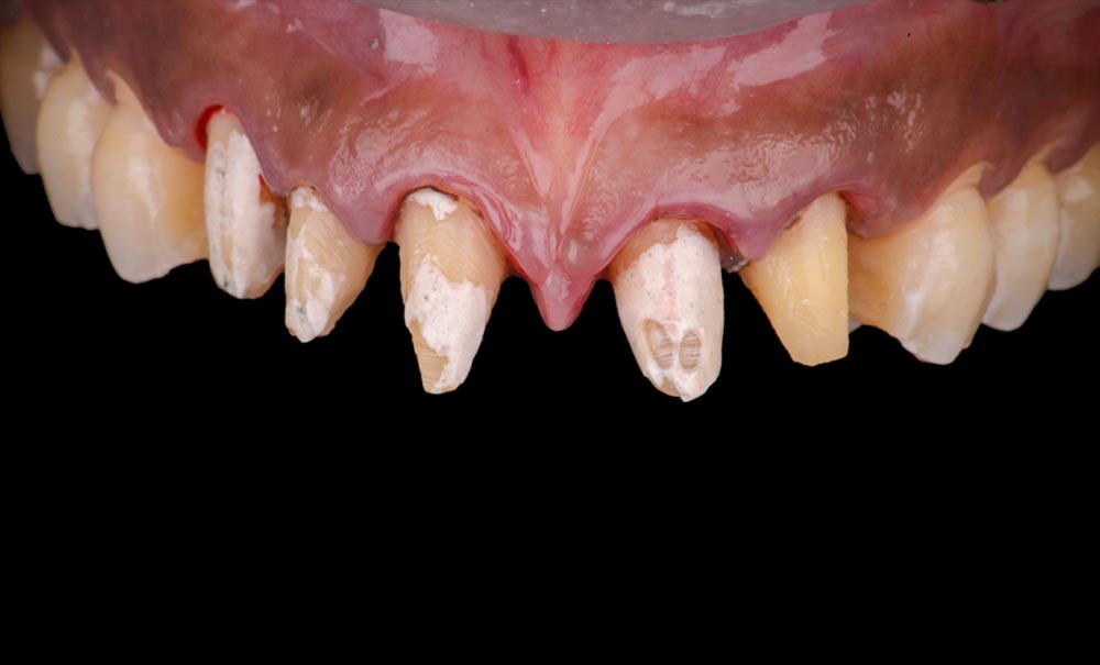 Afin de valider le résultat esthétique de la correction des diastèmes et du décalage des collets, un mock-up de motivation est réalisé en technique directe (fig. 3).