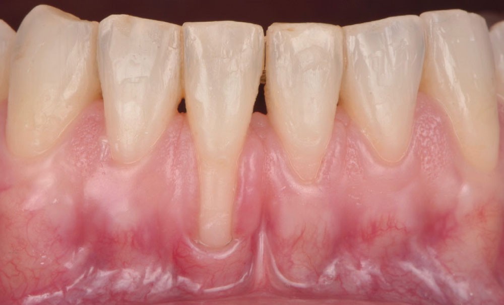L’analyse du phénotype parodontal met en évidence une gencive fine et transparente (phénotype fin), associée à une bande kératinisée réduite, voire absente. Le sondage parodontal confirme la stabilité du parodonte. La récession la plus profonde, observée sur la dent 4.1, mesure 6 mm (fig. 1b).