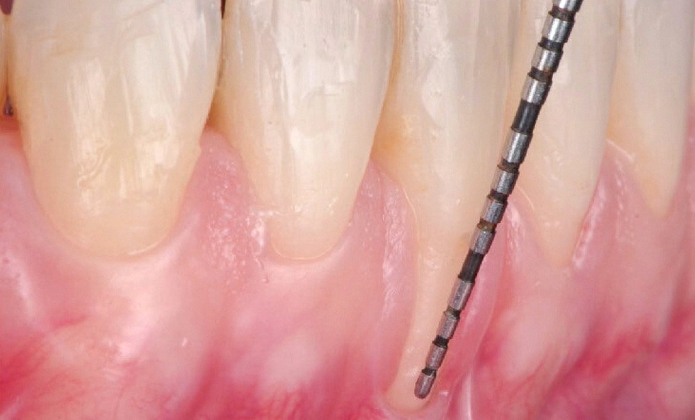L’analyse du phénotype parodontal met en évidence une gencive fine et transparente (phénotype fin), associée à une bande kératinisée réduite, voire absente. Le sondage parodontal confirme la stabilité du parodonte. La récession la plus profonde, observée sur la dent 41, mesure 6 mm (fig. 1b).