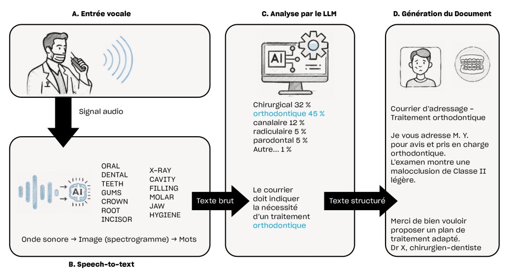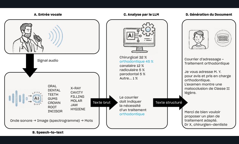 Une fois le texte brut obtenu, il devient possible de lui donner différentes formes selon le besoin clinique, tel que la rédaction d’un compte rendu interne au cabinet, d’un courrier de correspondance ou encore des consignes post-opératoires. Le modèle d’interprétation va alors analyser le sens général de la dictée, mettre en avant les éléments cliniques pertinents et les organiser en fonction du contexte choisi par l’utilisateur. Cette capacité d’adaptation repose en partie sur l’approche dite d’extraction « zero‑shot », qui correspond à la faculté du modèle à réaliser une tâche qu’il n’a pas spécifiquement apprise [2]. Grâce à cette flexibilité…