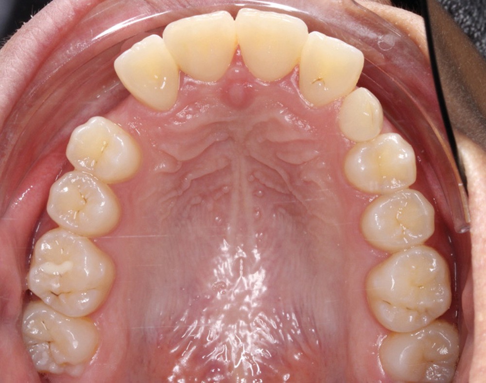Les extractions de 12, 22, 63, 34 et 44 ont été réalisées dans un premier temps. Un cache esthétique en résine composite a été élaboré à partir d’une clé en silicone obtenue sur les empreintes initiales et collé sur 11 et 21 afin de limiter l’impact psychologique de telles extractions (fig. 2a-b).