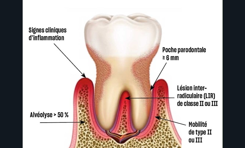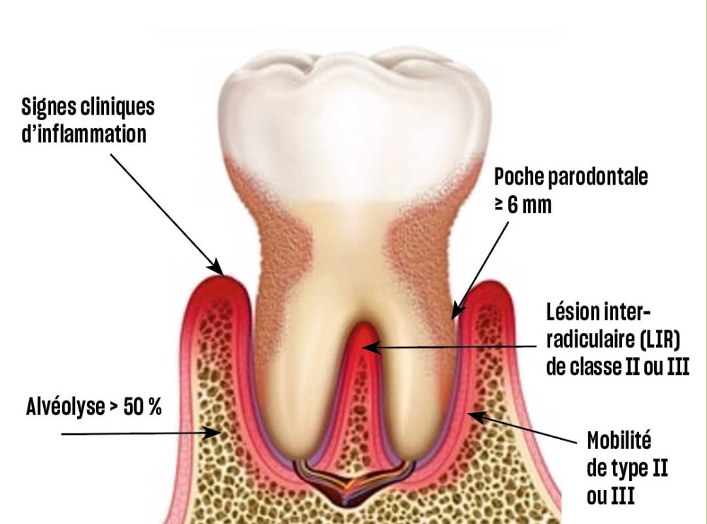 - atteinte de furcation de classe II (sondage > 3 mm sans passer de part en part) ou III (sondage de part en part) pour les dents pluriradiculées (classification de Hamp [8]).