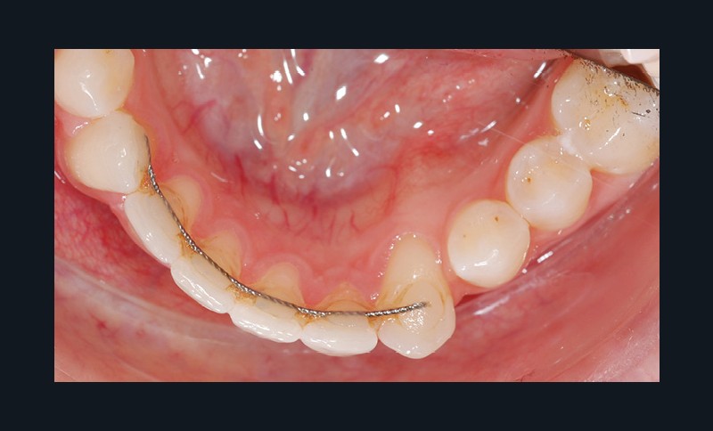 Par exemple, le retraitement d’un patient atteint d’un « Syndrome du fil » [2, 3], au vu de l’état des connaissances imparfaites de l’étiologie de cette situation, méritera une réflexion pour trouver un système de confiance. Une fibre collée est l’une des solutions sécurisantes (fig. 1). Mais, si la langue n’est pas stabilisée au repos comme en fonction, un dispositif amovible type Spring Retainer sera préférable.