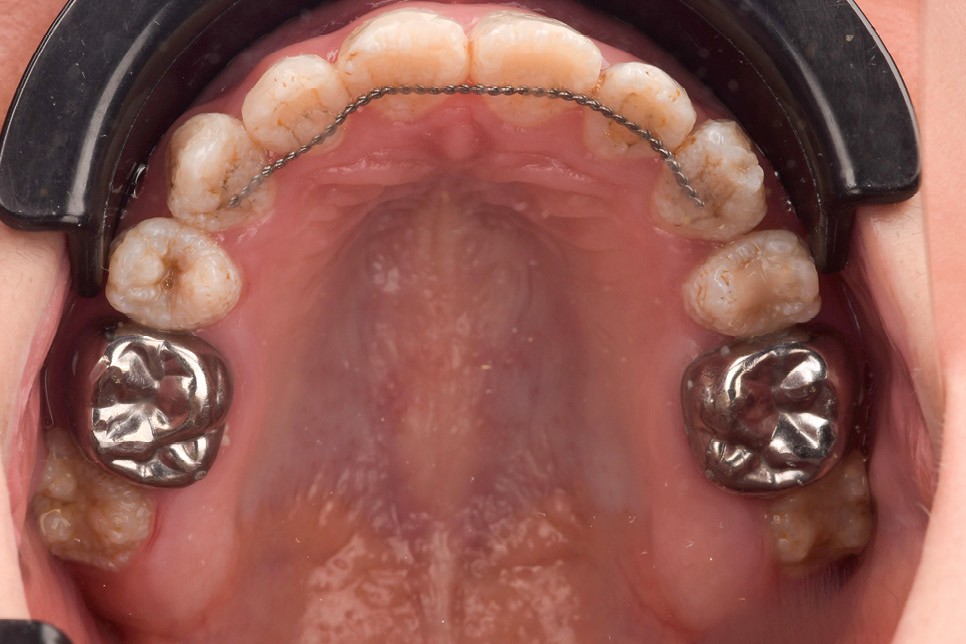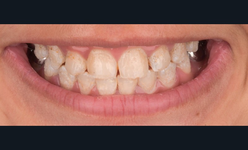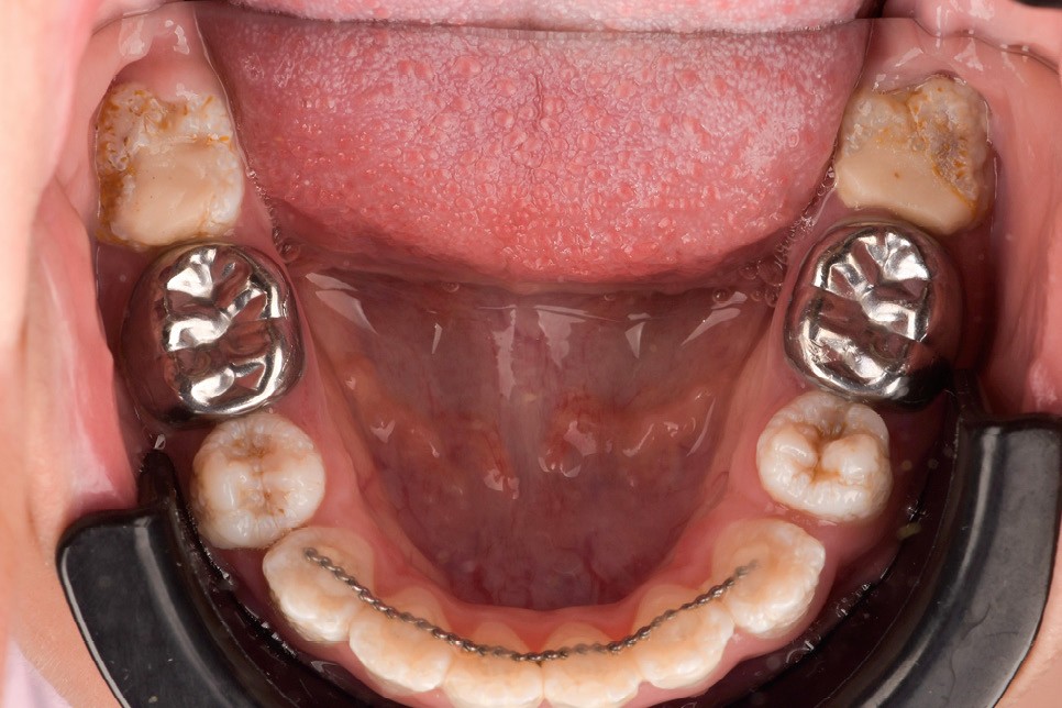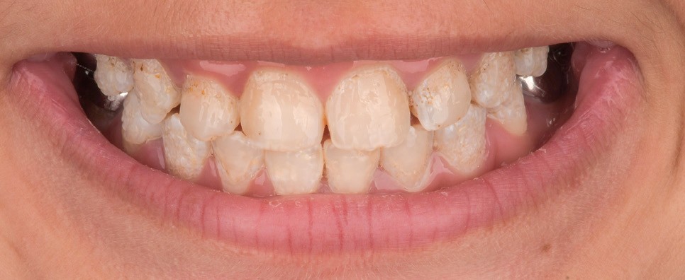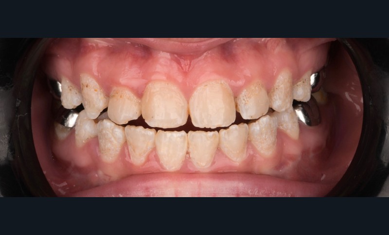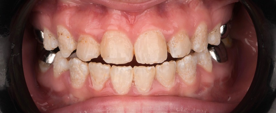 Lors de l’arrivée de la patiente, un examen clinique au fauteuil est effectué, complété par une empreinte numérique permettant l’enregistrement précis des arcades dentaires et de l’occlusion existante. Cet examen initial met en évidence une pathologie de type amélogenèse imparfaite. On note également la présence de couronnes métalliques au niveau des premières molaires, ainsi que de multiples restaurations, notamment au niveau des dernières molaires (fig. 1 à 4).