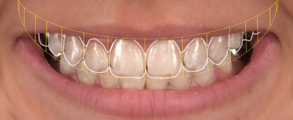 La première étape décisionnelle repose sur une analyse esthétique du visage et du sourire, réalisée à l’aide du logiciel SmileCloud. Cette analyse permet d’évaluer les proportions dentaires, la ligne du sourire et les rapports dento-labiaux. Elle confirme que le traitement vise à la fois la protection d’un émail de mauvaise qualité et l’amélioration de l’esthétique globale, avec notamment une optimisation des proportions dentaires (fig. 5 et 6).