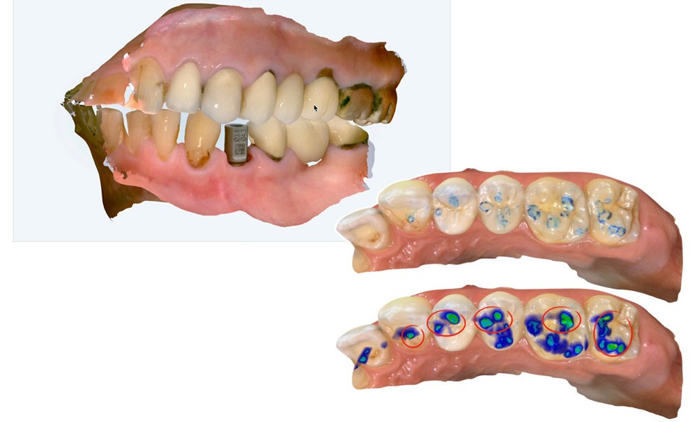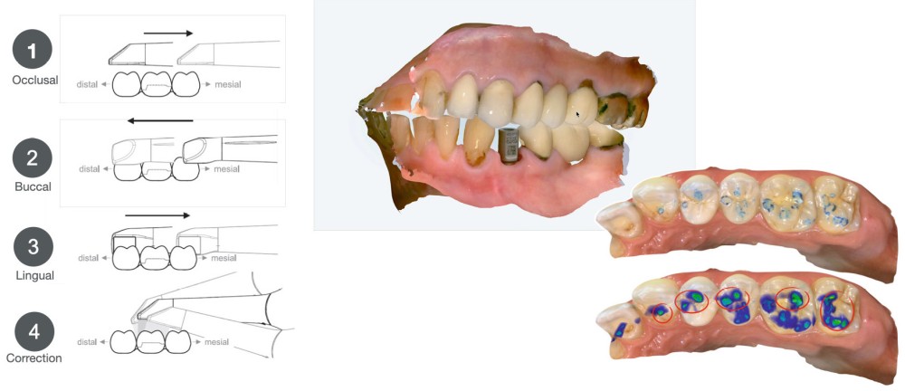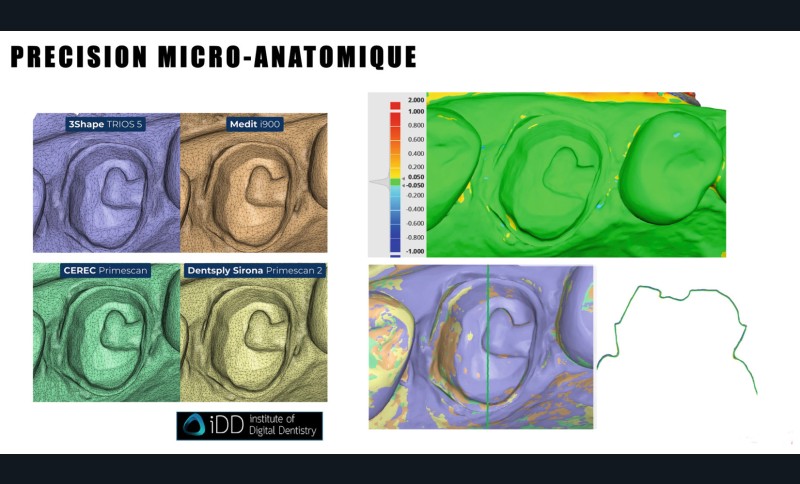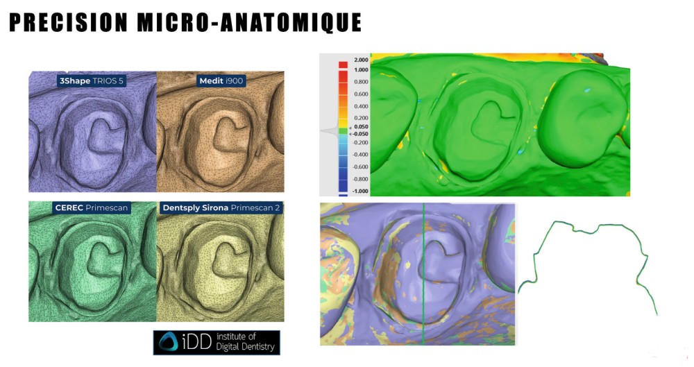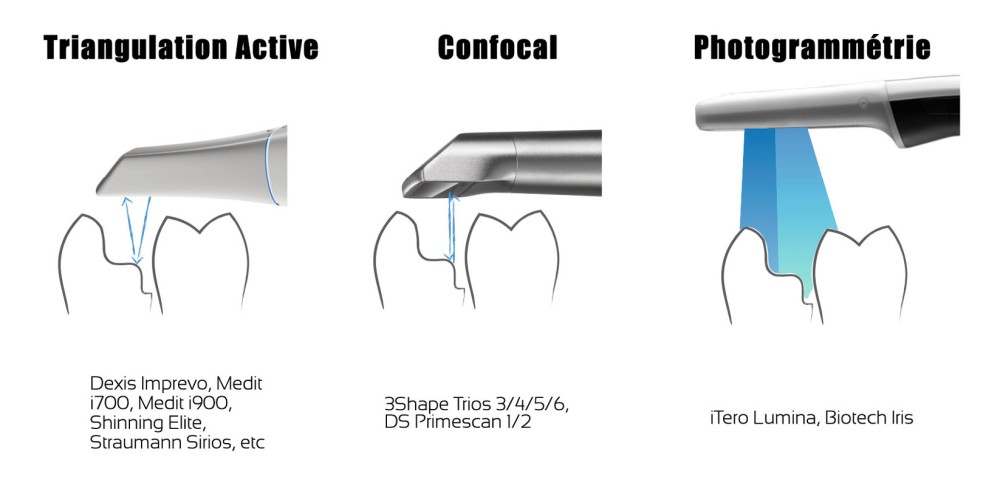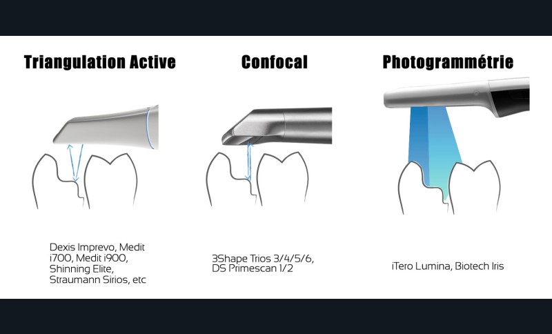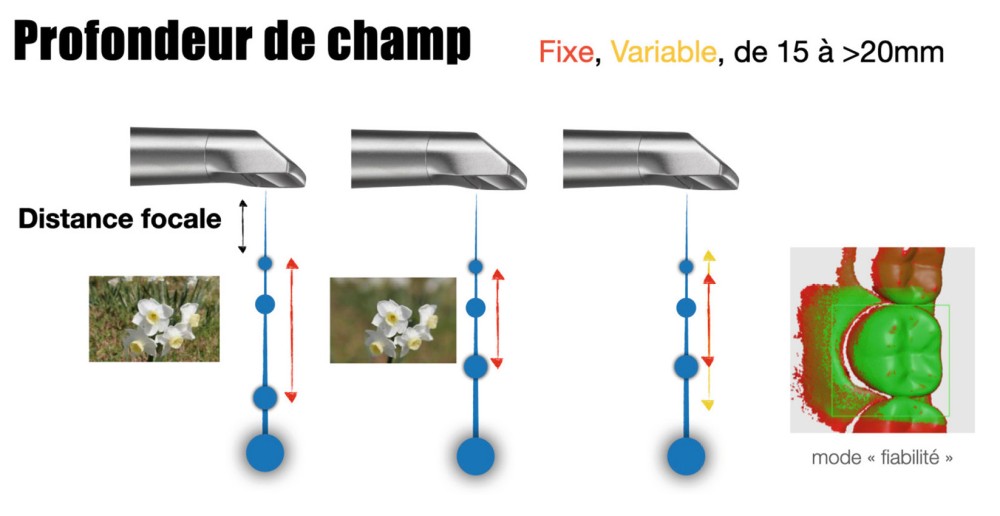 La précision micro anatomique dépend de la technologie du système de caméra intra-orale (SCI) (triangulation active, confocal, photogrammétrie) (fig. 2), en particulier la profondeur de champ (fig. 3). Il s’agit d’un critère essentiel : plus elle est grande, plus il sera possible d’enregistrer loin de la caméra de façon précise, ce qui est un avantage dans les limites profondes ou les zones édentées.