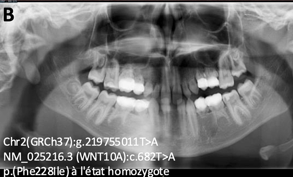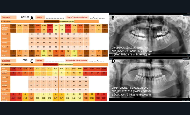 Ces modèles sont conçus pour être explicables (via la méthode SHAP ou Grad-CAM), garantissant transparence, éthique et confiance dans un usage clinique. Les résultats montrent déjà une capacité de prédiction de certains variants pathogènes pour les agénésies dentaires et les hypo/oligodonties (par exemple dans les gènes PAX9 ou WNT10A) à partir du patron de dents manquantes observé [5, 6] dans ces maladies rares (fig. 1).