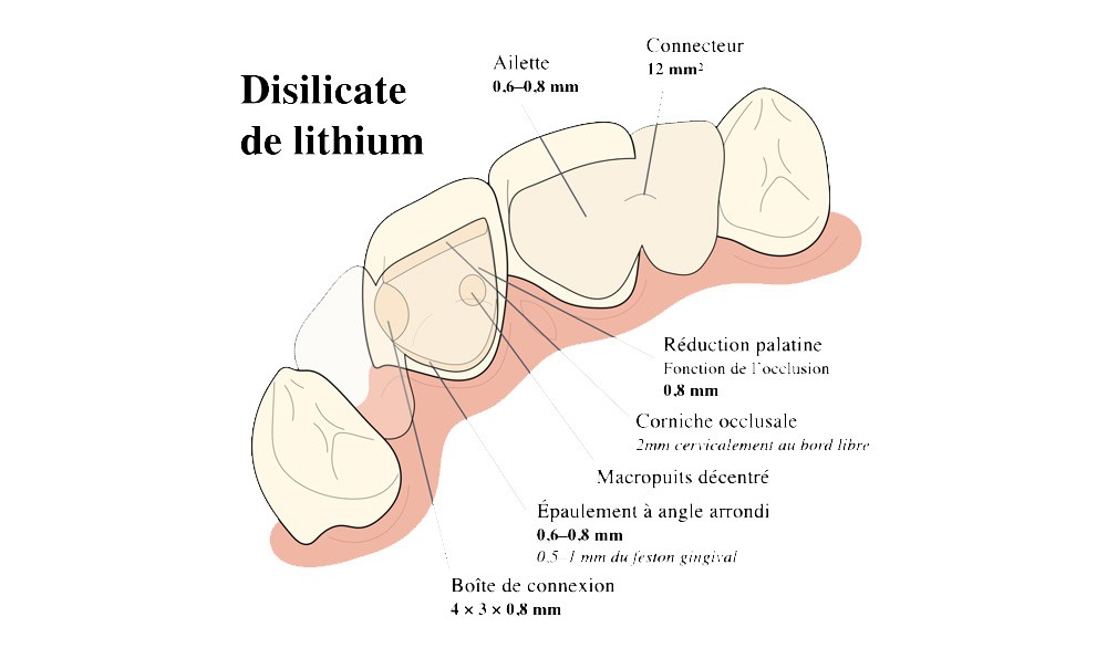 L’histoire du bridge collé antérieur est marquée par une double (r)évolution majeure. La première concerne le design, d’une part passé du double appui de part et d’autre de l’édentement à une géométrie cantilever, mono-ailette, mono-pilier, offrant de meilleures performances mécaniques et cliniques [8-10]. La seconde réside dans le choix du matériau d’infrastructure, avec la transition du métal vers les céramiques infiltrées, puis vers la zircone 3Y-TZP et le disilicate de lithium, désormais considérés comme les références alliant esthétique, biocompatibilité et aptitude au collage [11-15].