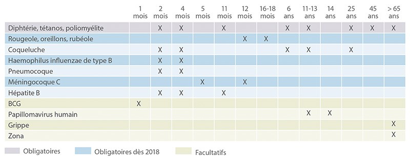 Depuis le 1er janvier 2018, les enfants de moins de 2 ans doivent être vaccinés contre 11 maladies pour pouvoir accéder à la « société », c’est-à-dire pour l’entrée en crèche, à l’école, en garderie, en colonie de vacances ou dans toute autre collectivité (tabl. II et III). Ces vaccins peuvent être faits jusqu’aux 18 mois de l’enfant, s’il n’est pas gardé dans ce type de collectivités avant cela.