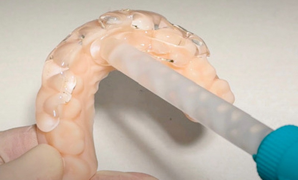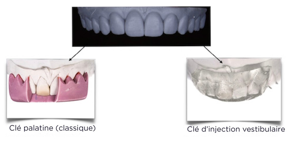 - clé en silicone transparente : elle peut être demandée au laboratoire ou être faite au cabinet (fig. 5). L’Exaclear (GC) est injecté dans un porte-empreinte et sur le modèle au niveau des wax up réalisés…