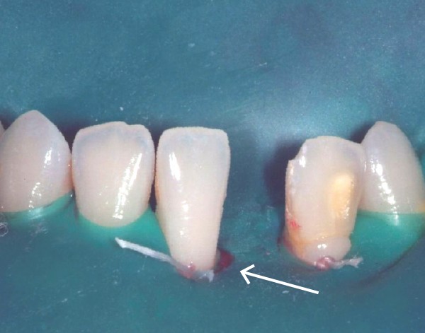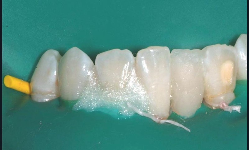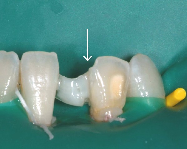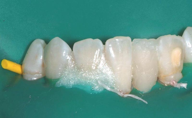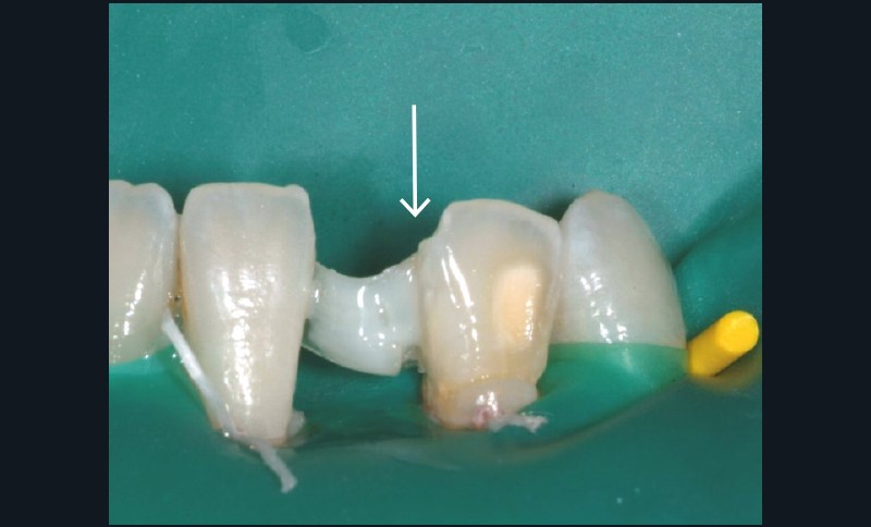 Dans un premier temps, la restauration existante a été déposée (fig. 4b). Après nettoyage et sélection de la teinte des dents, l’isolation complète des dents antérieures mandibulaires de 33 à 43 a été réalisée à l’aide d’une digue en caoutchouc et de ligatures (fig. 4c). Pour déterminer la longueur correcte du brin de composite renforcé de fibres de verre, l’espace interdentaire a été mesuré entre les faces linguales de 32 et 41 à l’aide d’une bande de caoutchouc (type Wedjets) et d’une sonde parodontale. Ensuite, les surfaces des dents 32 et 41 ont été mordancées, rincées et délicatement séchées. Un primer a été mis en place et un adhésif chargé a été appliqué sur les faces linguales et proximales et photopolymérisé. Une petite quantité de composite fluide a été appliquée sur la surface linguale de la dent 32, le brin de composite renforcé de fibres de verre a été positionné et maintenu à plat à l’aide d’une spatule de Heidemann et photopolymérisé initialement pendant 5-10 secondes. Le même traitement a été effectué sur la dent 41. Après polymérisation du brin de composite renforcé de fibres de verre qui constitue désormais l’infrastructure au comblement de l’édentement dans la région 31, l’infrastructure fibrée a été recouverte, au niveau de la zone du pontique, d’un opaqueur (Monopaque®, Ivoclar Vivadent) (fig. 4d), puis, dans la foulée, a eu lieu le modelage de l’intermédiaire de bridge en technique stratifiée (fig. 4e). La fibre a été recouverte sur toute la longueur de composite pour empêcher la pénétration d’humidité et la dégradation du matériau CRF pendant sa durée de vie intra-orale.