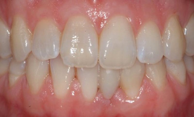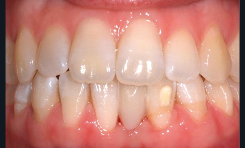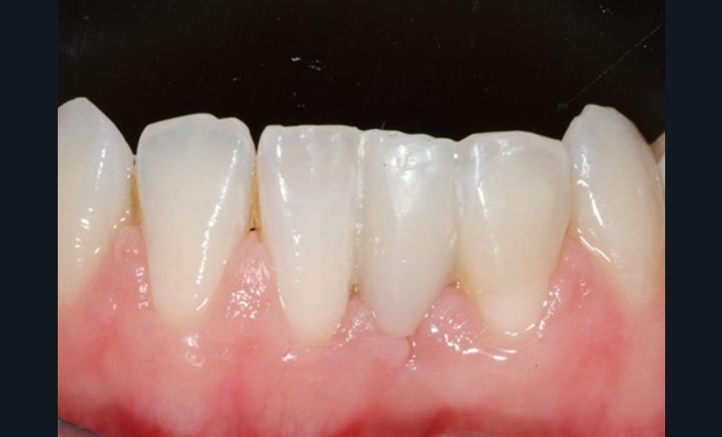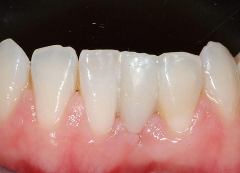 La durée d’observation est jusqu’à présent de trois ans. Il n’y a aucune différence entre la teinte et la translucidité du bridge CRF et des dents adjacentes (fig. 5a et 5b).