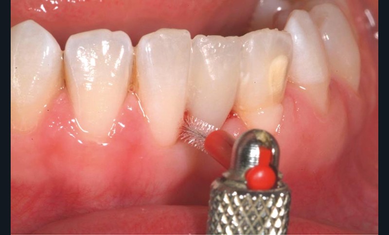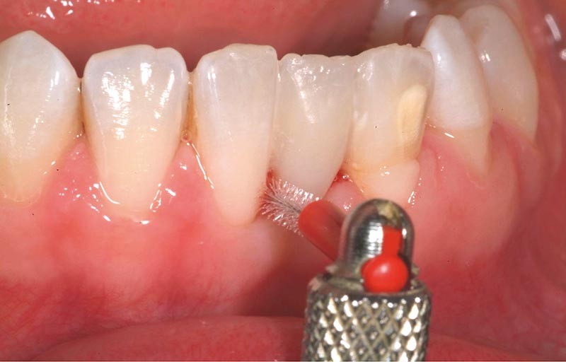 Le façonnage des espaces interdentaires et des zones de transition a été réalisé à l’aide d’une lame de bistouri en faucille (n° 12) et de rubans abrasifs de finition. Enfin, la mise en forme et le prépolissage ont été effectués à l’aide de fraises diamantées de fine granulométrie et le polissage et brillantage réalisé à l’aide de polissoirs en silicone et de brossettes (fig. 4f). En outre, un goupillon interdentaire de taille appropriée a été sélectionné pour permettre le nettoyage des espaces interdentaires 31/41 et 31/32 qui ne sont plus accessibles au fil de soie. La patiente a été formée au protocole de nettoyage (fig. 4g).