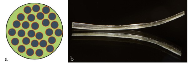 – une orientation unidirectionnelle des fibres dans le brin (fig. 1a et b) pour l’élaboration d’attelles à base de CRFs, de contentions post-orthodontiques ou de bridges CRFs pour le remplacement unitaire de dents dans le secteur antérieur ou postérieur ;