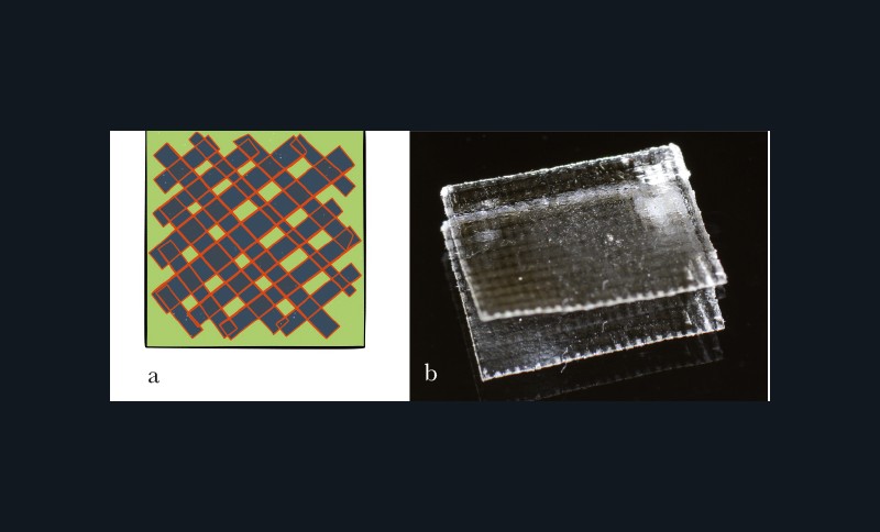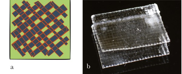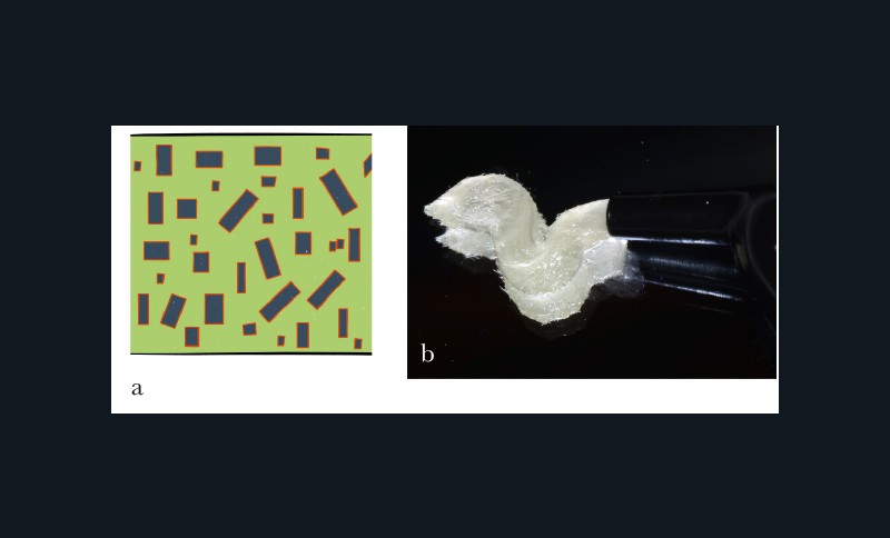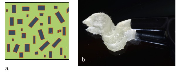 – une orientation orthogonale des fibres dans le réseau de CRFs (fig. 2a et b) pour un renforcement interne des restaurations en composite ou attelles de contention (post-traumatiques) de dents ou renforcement/réparation de facettes ;