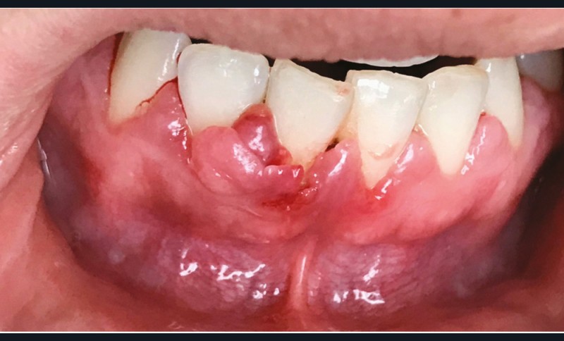 Les modifications hormonales à mettre en relation avec l’hygiène bucco-dentaire, les paramètres socio-économiques, l’âge précoce de la grossesse ainsi que l’augmentation du grignotage pourraient augmenter la prévalence des caries dentaires chez la femme enceinte. Ces patientes sont régulièrement sujettes à des envies multipliant le nombre de prises alimentaires souvent très riches en sucre. Ces apports sucrés, associés à la baisse du pH salivaire lors de la grossesse, entraînent un déséquilibre du cycle déminéralisation et de reminéralisation. Le risque carieux peut être augmenté, ainsi que la susceptibilité à l’érosion dentaire accrue par les vomissements et/ou les reflux gastro-œsophagiens [2]. L’action hormonale peut également avoir des répercussions sur les tissus parodontaux. La gingivite gravidique observée sur plus d’une femme enceinte sur deux, constitue une réponse inflammatoire de la gencive exacerbée par la présence de plaque bactérienne, et favorisée par l’augmentation des taux d’œstrogène et de progestérone [3] (fig. 1). 5 % des futures mères développeront un épulis, dont l’étiologie reste méconnue (fig. 2) [4].
