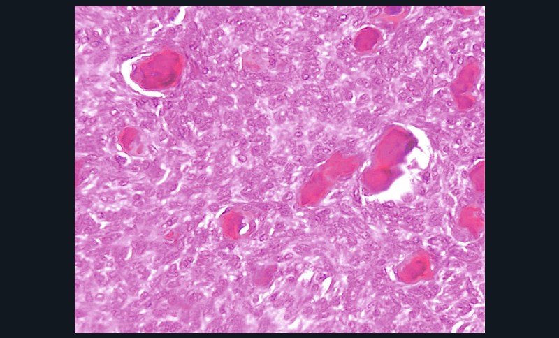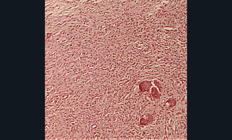 - Histologie : ulcération recouvrant une zone inflammatoire polymorphe associée à une zone fibreuse contenant de petites calcifications plus ou moins associées à de l’os trabéculaire métaplasique, parfois bordées d’ostéoclastes (fig. 3c).