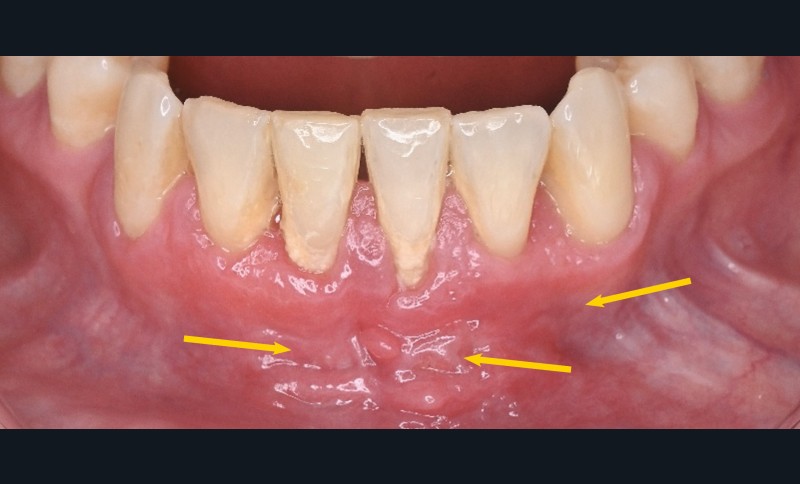 Une patiente de 29 ans, sans antécédent médical rapporté et non-fumeuse, consulte pour une inflammation gingivale persistante, malgré plusieurs traitements parodontaux non chirurgicaux réalisés par trois praticiens. Elle décrit des saignements gingivaux fréquents ainsi qu’une sensibilité marquée au brossage, notamment au niveau des incisives mandibulaires. L’hygiène bucco-dentaire est assurée deux fois par jour à l’aide d’une brosse à dents de type médium. De surcroît, depuis deux mois, et sur les conseils du dernier praticien, elle a remplacé son dentifrice par un mélange « maison » à base de bicarbonate de soude et d’eau oxygénée, sans ressentir, toutefois, d’amélioration de son état buccal.