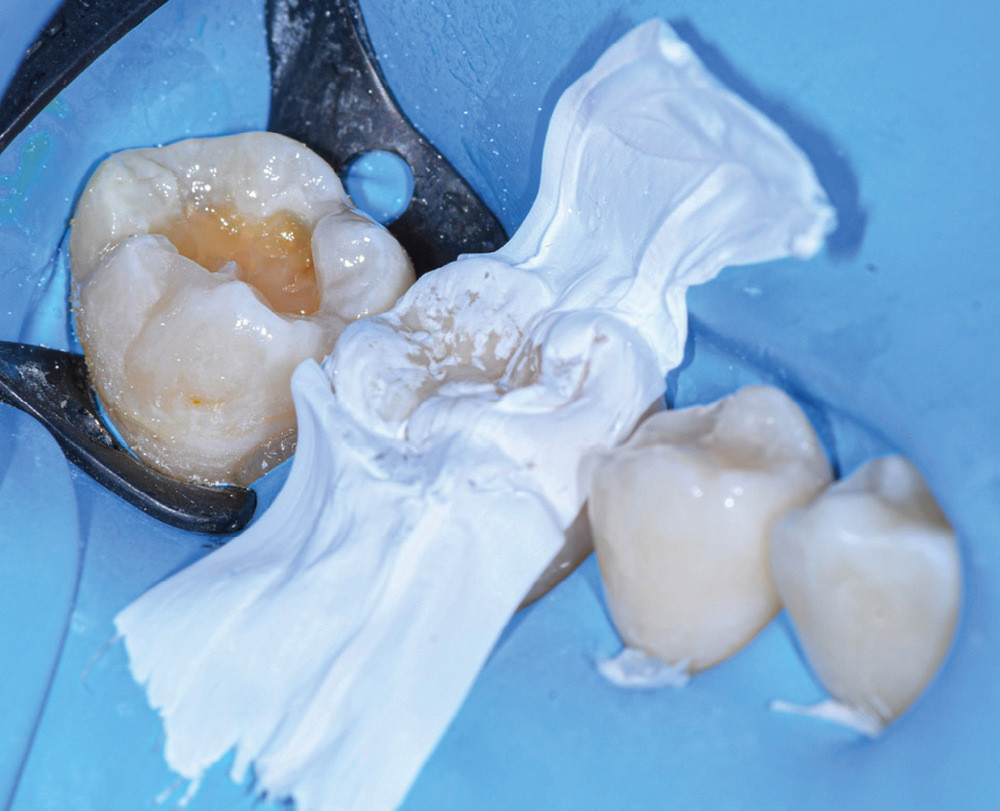 Il est tout à fait possible d’utiliser cette technique lorsque la cavité a atteint une paroi proximale. Il suffit alors de recréer d’abord le mur proximal manquant en résine composite, puis d’ajuster le tampon pour qu’il n’interfère pas avec ce dernier. La cavité de classe II se transforme alors en cavité de classe I [7].
