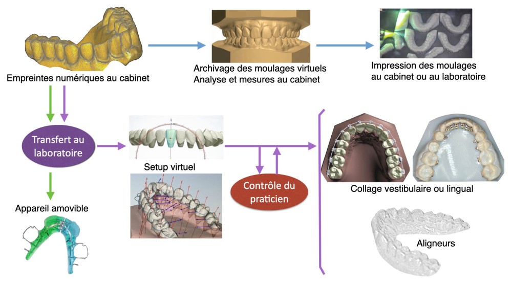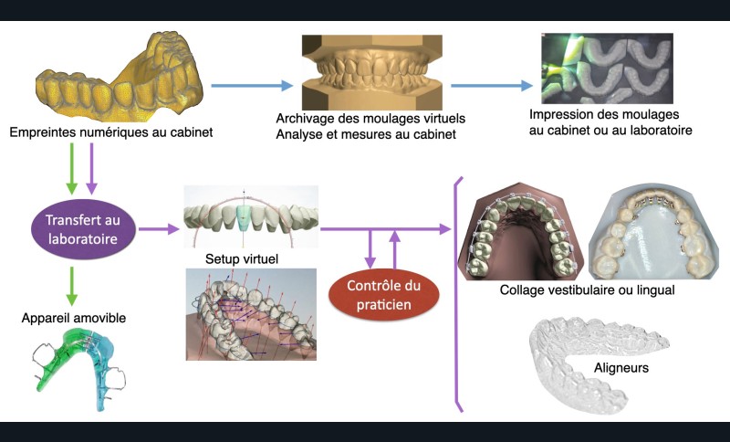 Le flux de travail (fig. 1) commence par une empreinte optique réalisée à l’aide d’un scanner intra-oral. Cette empreinte est ensuite importée dans le logiciel de simulation de déplacement dentaire, où une série d’étapes est réalisée afin d’obtenir la simulation de traitement virtuelle. Ensuite les fichiers de chaque étape sont exportés au format .stl, puis envoyés à une imprimante 3D afin de produire un modèle physique servant de moule pour le thermoformage des aligneurs [1, 2].