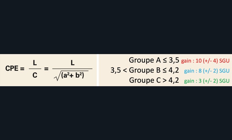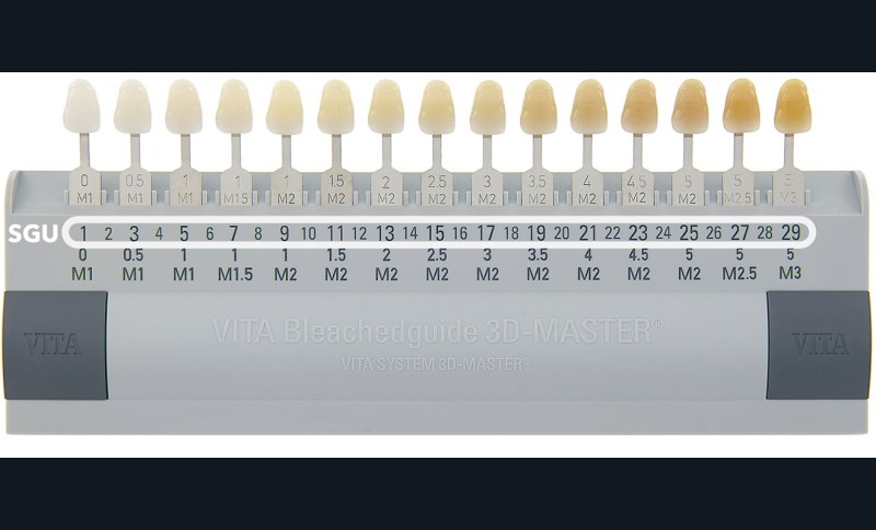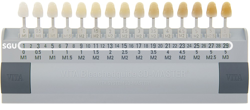 L’éclaircissement dentaire constitue l’un des traitements esthétiques les plus demandés en pratique clinique [1]. Cet intérêt croissant se reflète dans l’augmentation continue du volume de publications scientifiques consacrées à cette thématique au cours des deux dernières décennies [2]. Toutefois, une importante variabilité interindividuelle persiste, rendant difficile la prédiction du résultat final. Les dispositifs numériques de mesure colorimétrique, tels que les spectrophotomètres Easyshade (VITA Zahnfabrik) ou Cobra (Borea), permettent une évaluation fiable de la couleur dentaire à partir des coordonnées Lab* [3]. Les mesures colorimétriques issues de ces spectrophotomètres peuvent être mises en correspondance avec le teintier Vita Bleachguide grâce à l’indice SGU (Shade Guide Unit) [4, 5]. Le Coefficient Potentiel d’Éclaircissement (CPE), développé à partir des valeurs Lab*, a permis de quantifier le pronostic d’éclaircissement dentaire de manière simple, en s’affranchissant des interprétations subjectives. Toutefois, cette simplicité, bien que constituant un avantage, représente probablement une limite lorsqu’il s’agit de quantifier précisément le gain en SGU (ΔSGU) entre la situation initiale et l’état final post-éclaircissement (fig. 1) [6, 7].