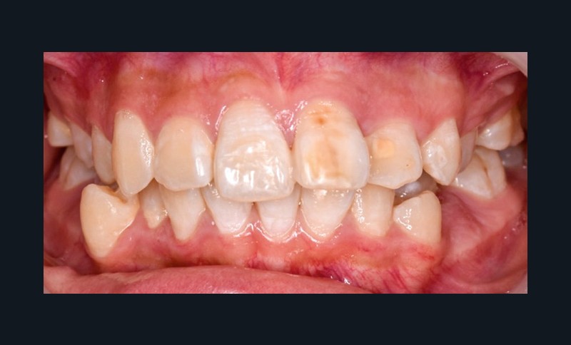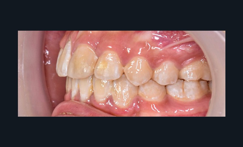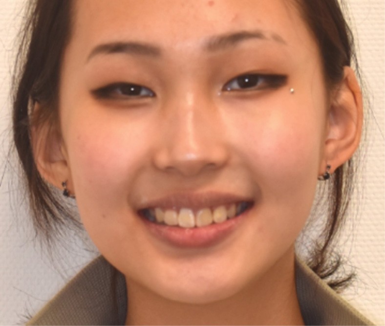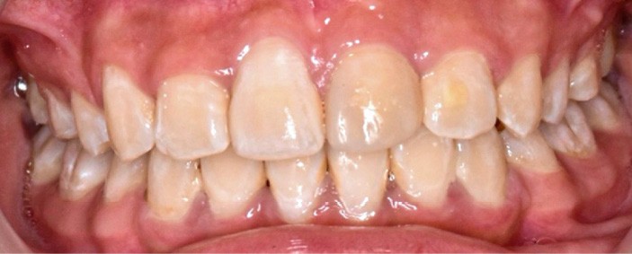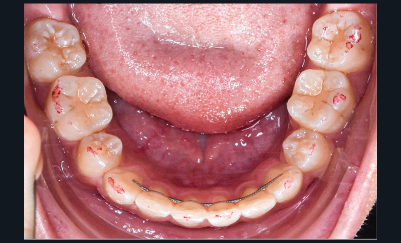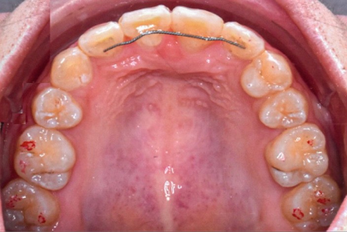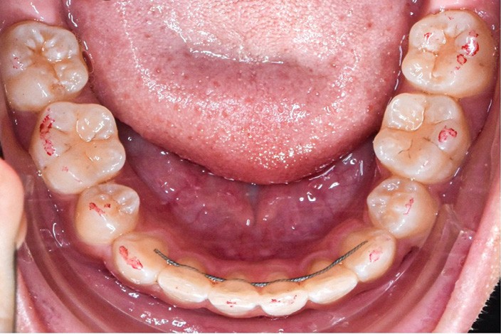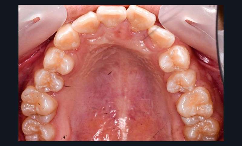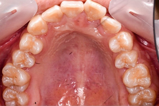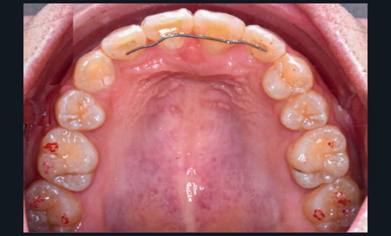 Par ailleurs, le rendu esthétique final du sourire reste marqué par une légère dyschromie entre les 11 et 21. Cela s’explique à la fois par la teinte plus saturée de la canine stratifiée, mais aussi par la discrète fluorose — visible en début de traitement sous forme de stries blanchâtres sur les incisives maxillaires et mandibulaires. De plus, l’apparition de white spot lesions secondaires au traitement a accentué le contraste chromatique. Un apport de vernis fluoré et une prise en charge par érosion-infiltration des lésions fluorotiques sont prévus afin d’harmoniser les teintes [4].