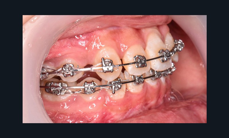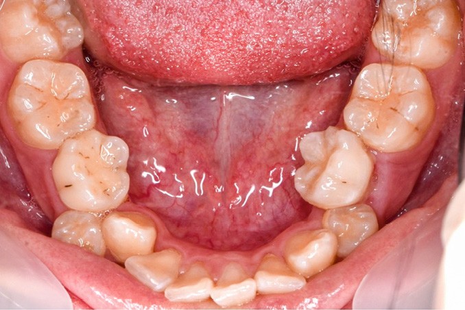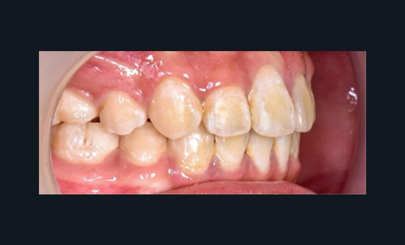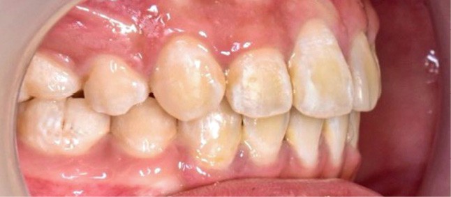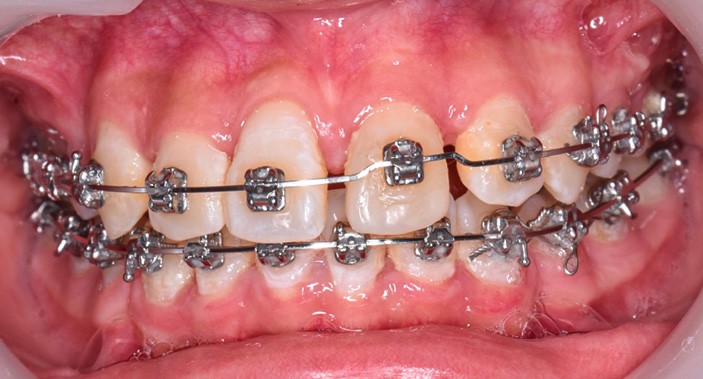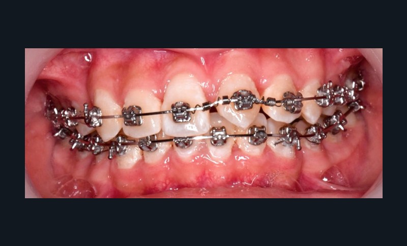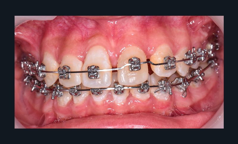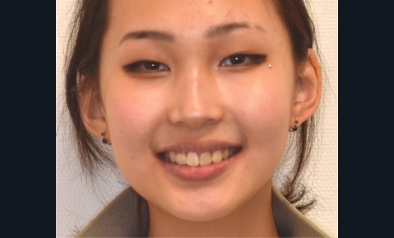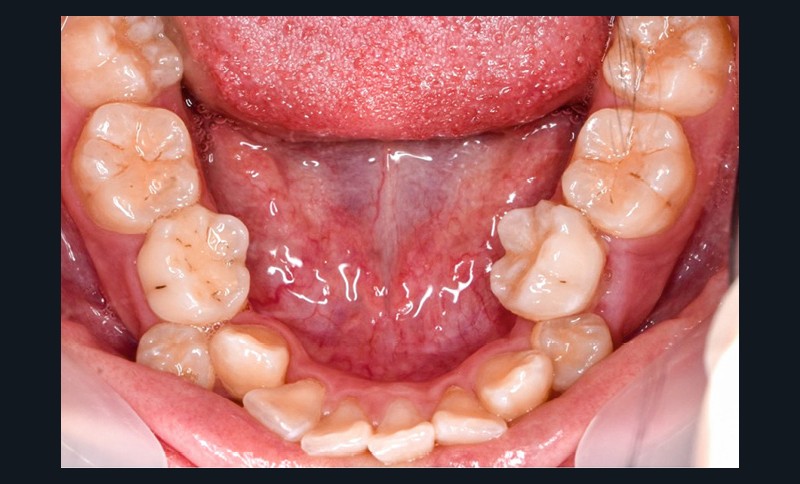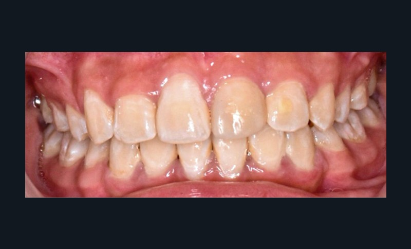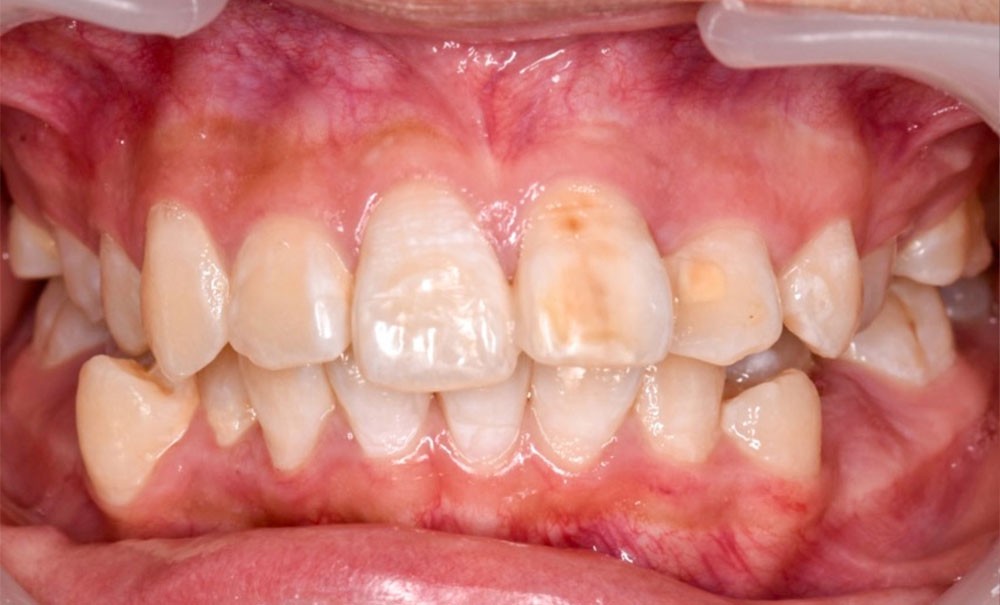 Par ailleurs, le rendu esthétique final du sourire reste marqué par une légère dyschromie entre les 11 et 21. Cela s’explique à la fois par la teinte plus saturée de la canine stratifiée, mais aussi par la discrète fluorose — visible en début de traitement sous forme de stries blanchâtres sur les incisives maxillaires et mandibulaires. De plus, l’apparition de white spot lesions secondaires au traitement a accentué le contraste chromatique. Un apport de vernis fluoré et une prise en charge par érosion-infiltration des lésions fluorotiques sont prévus afin d’harmoniser les teintes [4].
