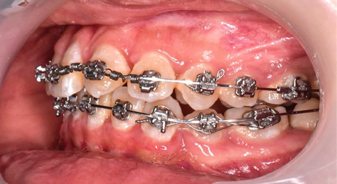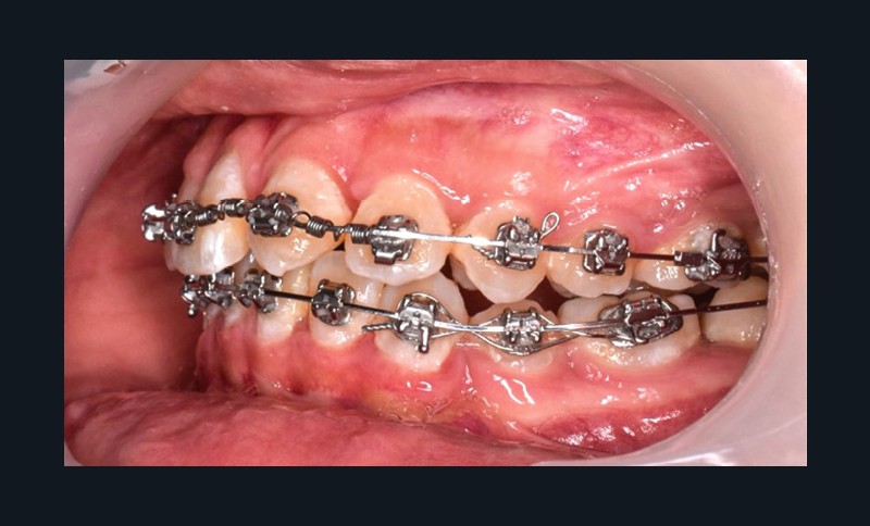 L’objectif du traitement est la correction de la DDA tout en assurant le remplacement de la 21 compromise. Décision a été prise d’extraire 34 et 44, ainsi que 21 et 14. La traction de la 23 a été réalisée à l’aide de forces légères, sur un arc transpalatin (fig. 9). Le nivellement et l’alignement, puis une mécanique par glissement ont permis d’aménager l’espace suffisant à la stratification de la canine. Elle associait un ressort en nickel-titane à des élastiques de Classe II (4 ½ oz, 3/16’’) sur un arc en acier .019×.025. Une phase d’ingression a été réalisée pour ajuster le niveau du bord libre de la canine à celui de l’incisive controlatérale (fig. 10-12).