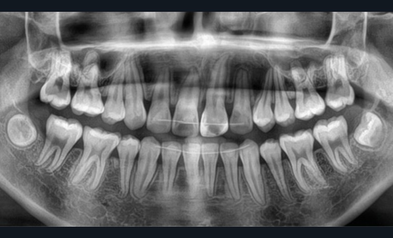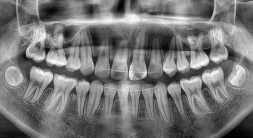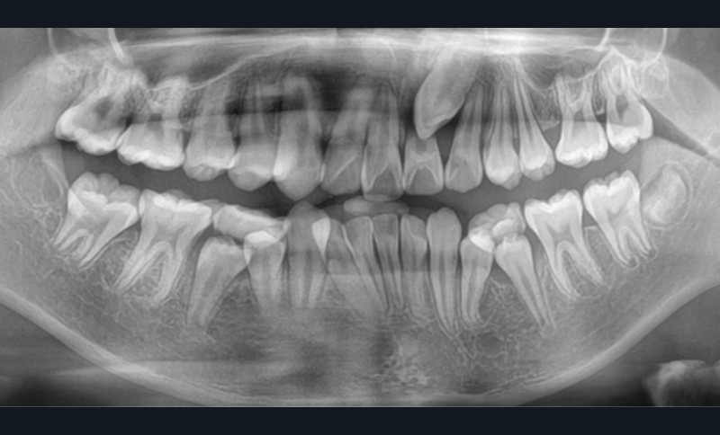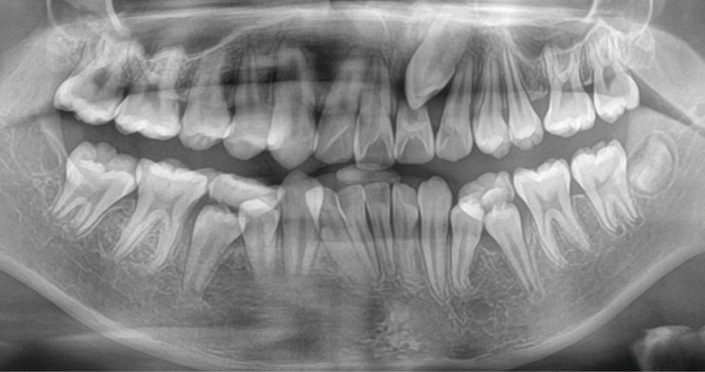 Une patiente âgée de 12 ans se présente en consultation, motivée par la position de son incisive centrale maxillaire, décrite comme « en avant », marquée par une dyschromie et une mobilité de grade 2 selon Muhlemann. L’examen clinique montre l’absence de 23 sur l’arcade, une dysharmonie dents-arcade marquée, un surplomb accentué, et une déviation des milieux inter-incisifs, conséquence du comblement spontané de l’espace de 23. L’ensemble s’inscrit dans un contexte de Classe I d’Angle molaire. L’orthopantomogramme révèle l’inclusion de 23, associée à une résorption radiculaire étendue aux deux tiers de 21. La 22 ne présente aucune altération visible.