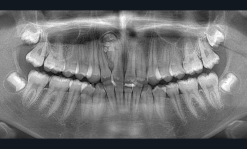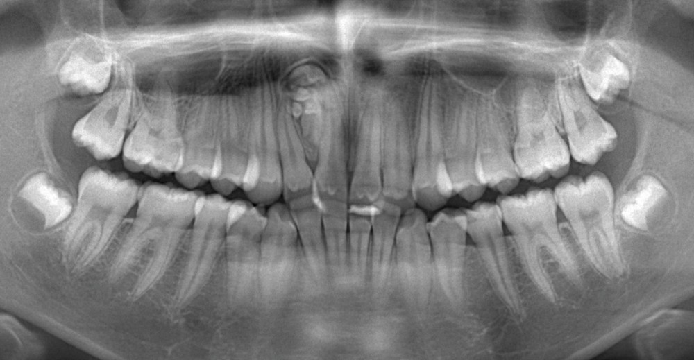 Une patiente âgée de 12 ans, sans symptomatologie a réalisé une radiographie panoramique (fig. 1).