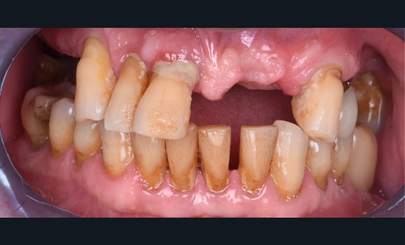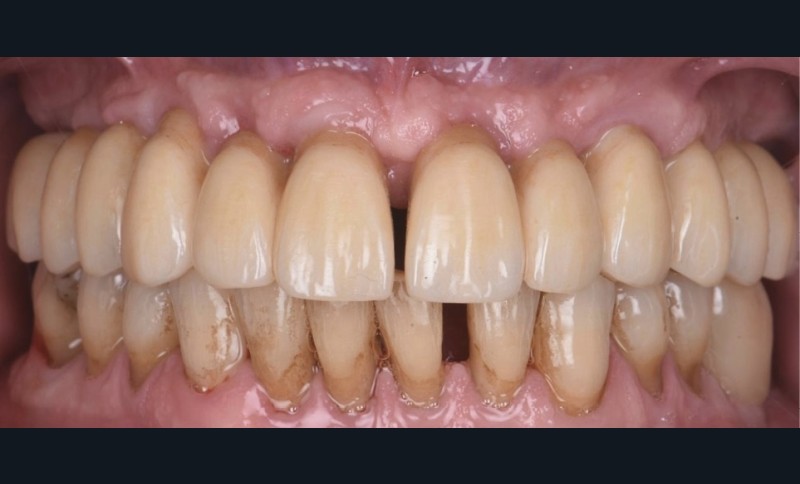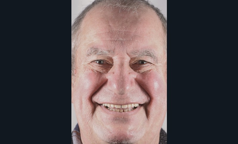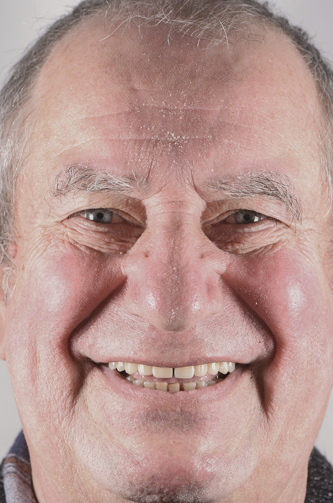 La segmentation permet également de limiter les erreurs d’empreintes implantaires et de diminuer les contraintes biomécaniques [6]. L’utilisation de la zircone Katana YML (Kuraray®) [7] permet de créer une extension mésiale et distale [8] en secteur 2, limitant alors la réalisation d’une augmentation sinusienne [7]. Nous remarquons, un an et demi après la pose, un maquillage naturel des bridges provisoires type « FP2 » (fig. 9) ainsi qu’une bonne intégration dans le visage de notre patient (fig. 10).