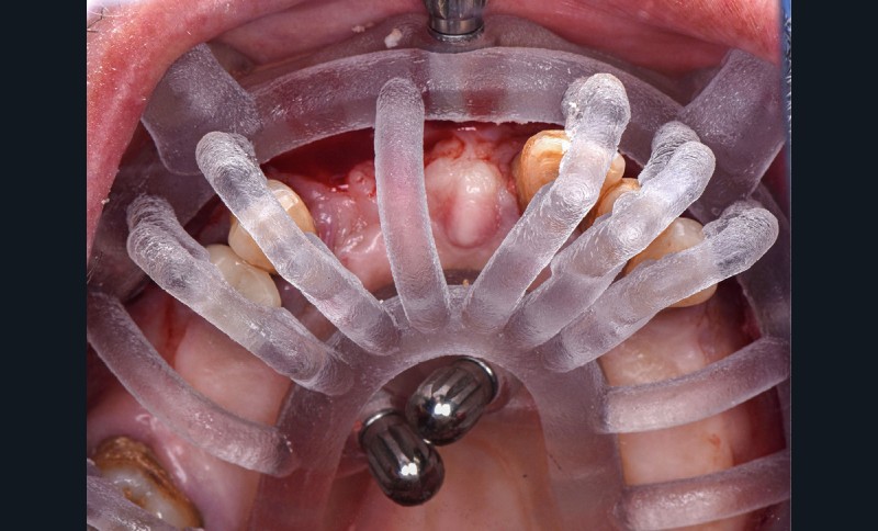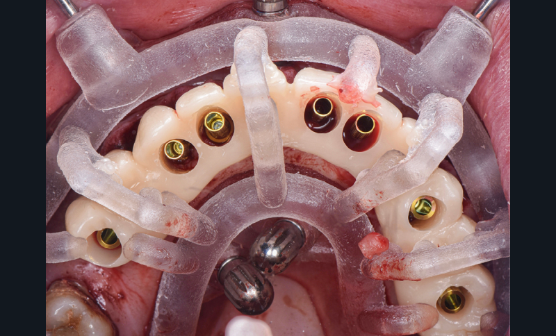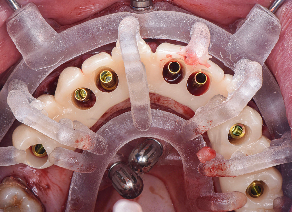 Nous positionnons le guide de positionnement (relié au guide de base) sur les dents restantes (fig. 2). Nous vérifions l’ajustage avant de fixer transitoirement ces derniers à l’arcade maxillaire via 6 clavettes de stabilisation MIS®. À ce stade, nous pouvons désolidariser le guide de positionnement, extraire les dents non conservables et positionner le guide de forage implantaire sur le guide base. Nous utilisons la séquence chirurgicale guidée de chez Mis implant® (Dentsply Sirona). Sept implants MIS® C1 sont positionnés à travers le guide (fig. 3) et sept piliers intermédiaires sont vissés sur ces derniers. À ce stade, nous positionnons le bridge en PMMA dans son « panier », sur le guide de base et nous le solidarisons avec les piliers provisoires via une résine fluide macro-chargée (fig. 4).