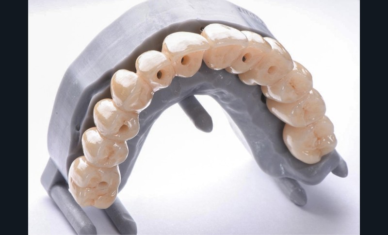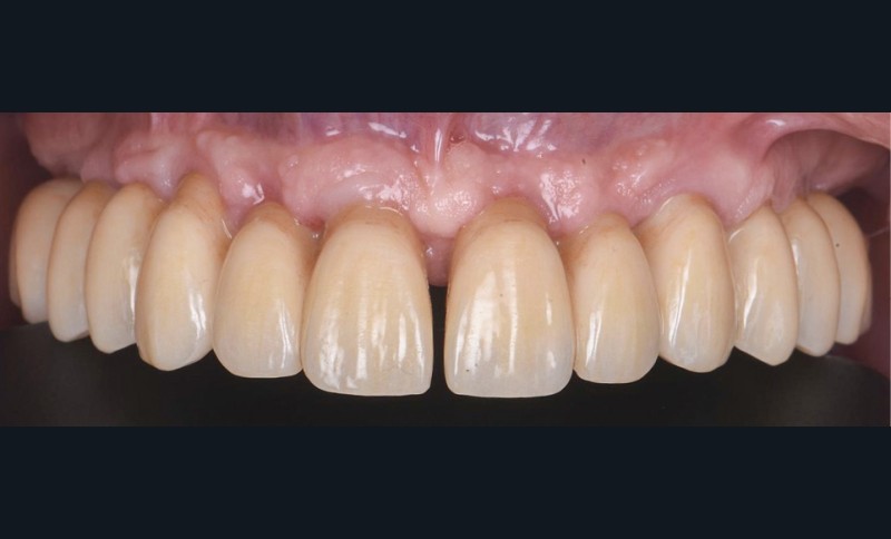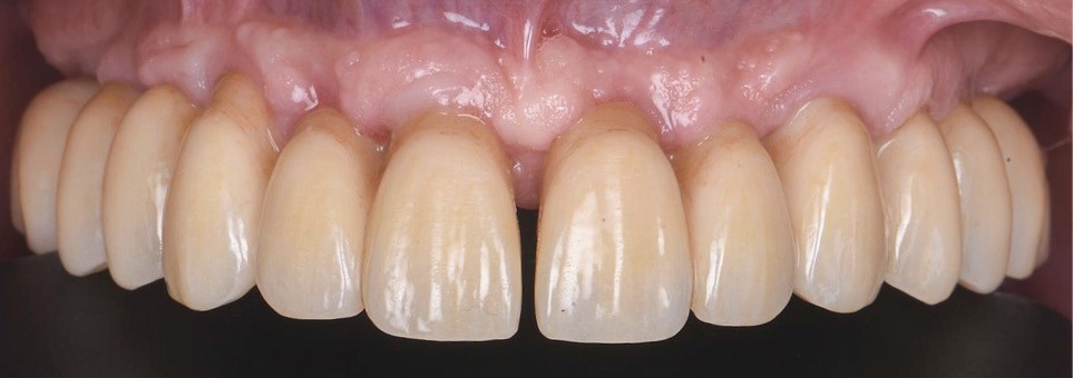 Notre laboratoire interne peut alors modeler les profils d’émergences implantaires, le temps de la réalisation des différents apports de tissus conjonctif sur les zones concaves. Puis nous mettons en place le bridge provisoire avec des sutures suspendues (fig. 5), en prenant soin d’équilibrer l’occlusion. Nous remarquons une simulation de diastème inter-incisif afin de satisfaire transitoirement la demande du patient. Trois mois après, le bridge provisoire a fait son travail de modelage gingival (fig. 6). Nous pouvons alors réaliser les acquisitions numériques pour la réalisation de la prothèse définitive (fig. 7). Nous remarquons deux bridges distincts séparés en inter-incisif afin de créer le diastème désiré par le patient (fig. 8).