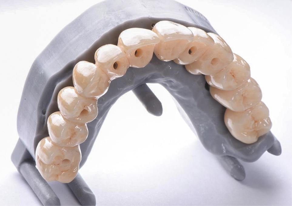 L’empreinte numérique et la puissance des logiciels de planification permettent de prévoir l’ensemble de la chirurgie à l’avance : on obtiendra un guide de forage implantaire et prothétique. On parle de guides à étages [5]. Nous verrons, dans le cas clinique suivant, comment l’apport du numérique, l’utilisation de nouveaux biomatériaux et l’évolution des concepts chirurgico-prothétiques nous ont permis de transformer une arcade maxillaire présentant des dents non conservables en un bridge complet implanto-porté sans phase provisoire amovible.