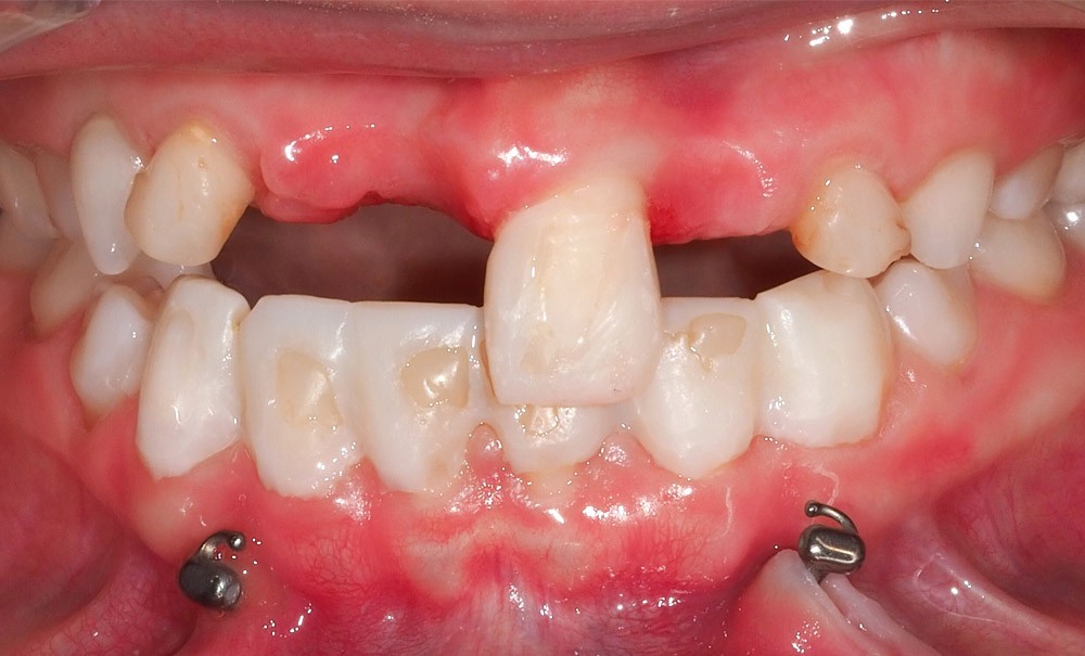 Le patient est un adolescent de 15 ans, présentant une oligodontie d’origine non syndromique [1,2]. Il est pris en charge et suivi depuis ses 8 ans par un chirurgien-dentiste et un orthodontiste. Lors de notre première consultation, les édentements maxillaires sont compensés à l’aide d’un arc transpalatin, support de 3 dents prothétiques de type « baby teeth ». Il présente également deux plaques de Bollard qui émergent au niveau de la gencive libre mandibulaire et ne sont plus utilisées depuis deux ans. Ces dispositifs orthodontiques permettent un ancrage squelettique pour les mouvements dentaires difficiles afin d’éviter de solliciter les dents. Seulement, le traitement orthodontique n’avançant plus, le praticien a préféré stabiliser la situation clinique, sans parvenir à fermer les espaces et la béance antérieure. Le motif de consultation du patient est donc multiple. Tout d’abord, il demande le retrait des plaques de Bollard à cause d’une importante gêne fonctionnelle. De plus, il souhaite restaurer l’esthétique de son sourire, notamment pour être plus à l’aise socialement.