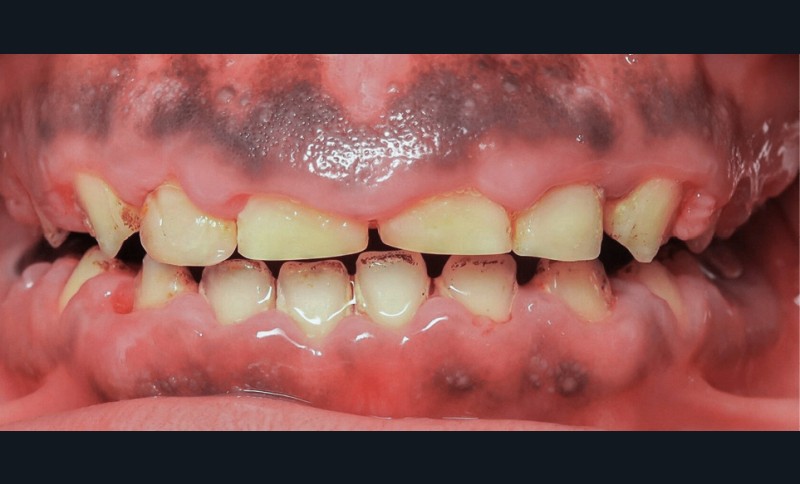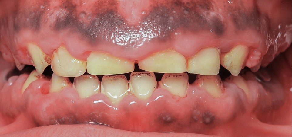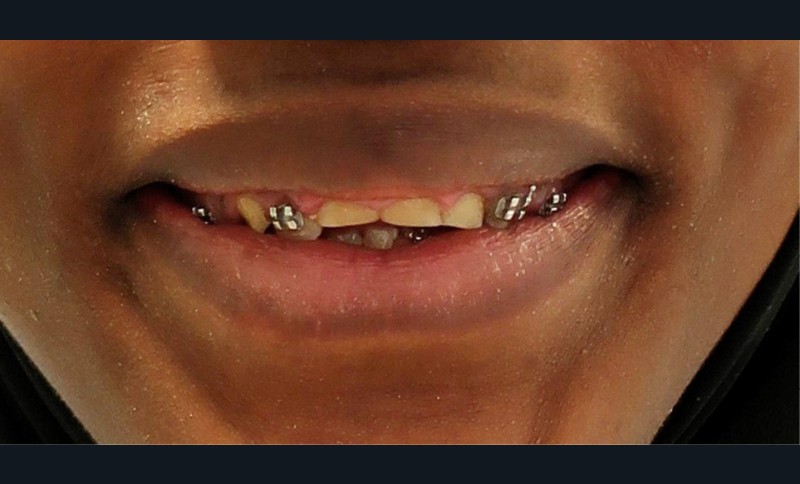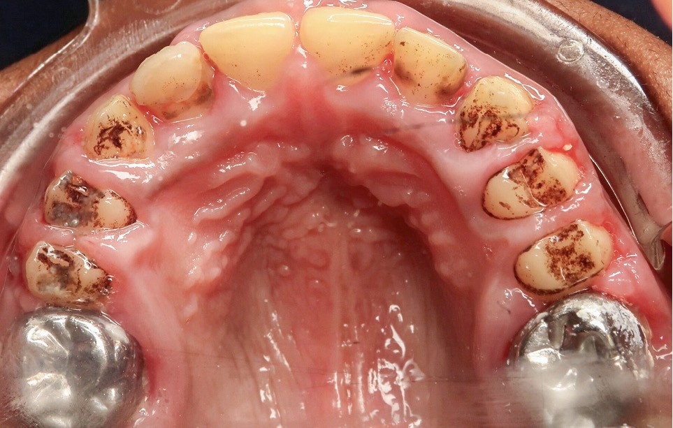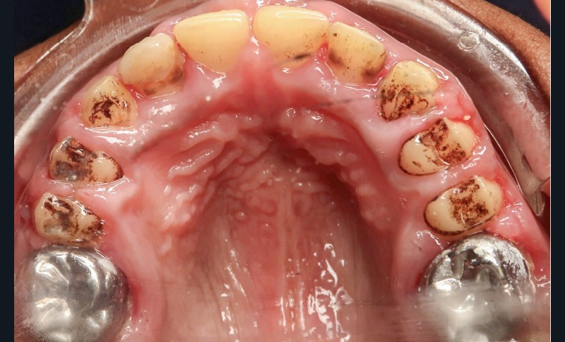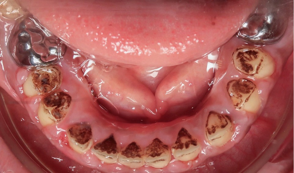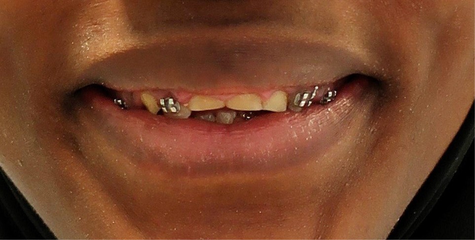 Une jeune femme de 18 ans est adressée après l’arrêt d’un traitement d’orthodontie en raison de décollages répétés et d’un refus d’intervention orthognathique. Les moyens financiers sont limités et les contraintes de déplacement importantes. Le tableau clinique évoque une mutation FAM20A [4] potentiellement liée à un syndrome émail-rein [5] ; un bilan génétique est prescrit.