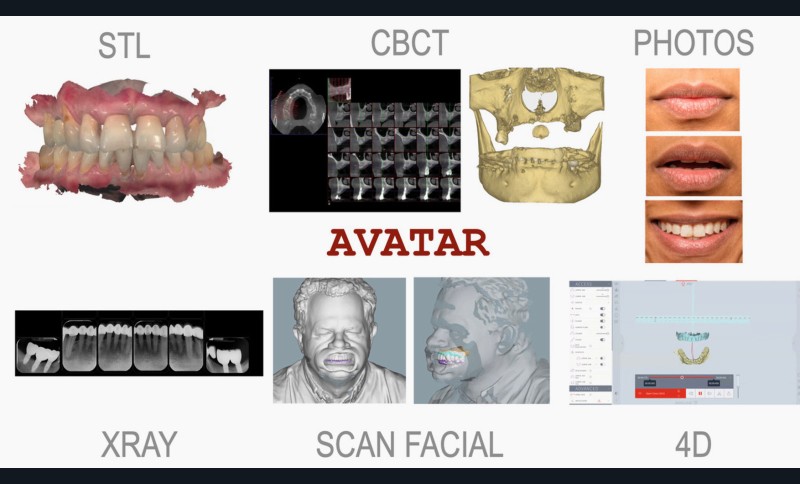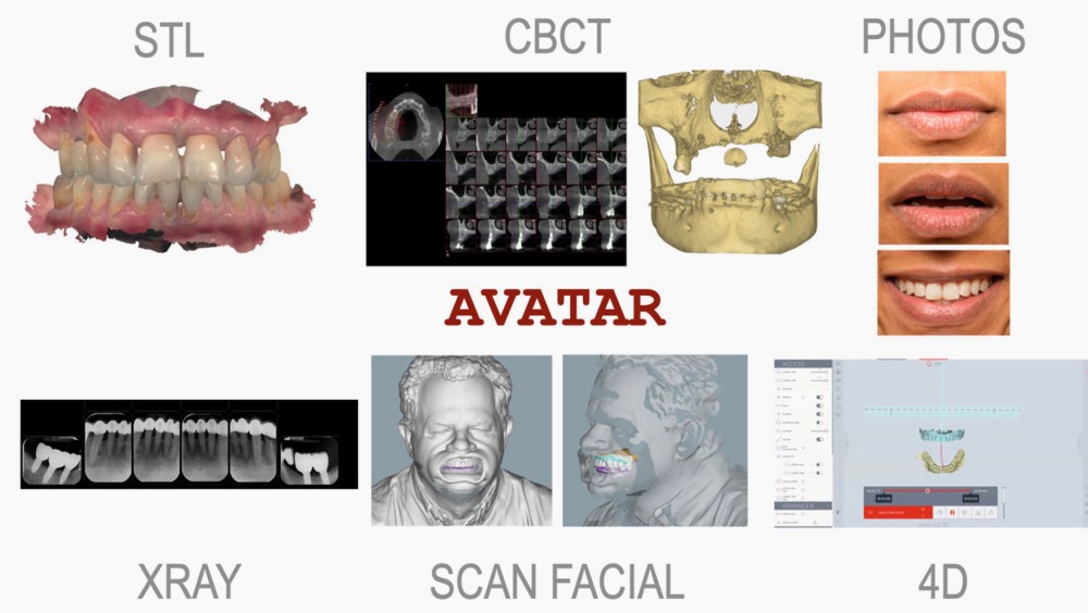 L’observation clinique et esthétique constitue le point de départ incontournable. Elle repose sur un bilan photographique standardisé, intégrant des vues de face et de profil, permettant l’analyse des lignes de symétrie, des plans de référence horizontaux et verticaux, ainsi que des rapports dento-faciaux. L’apport majeur des technologies numériques réside dans la création d’un véritable avatar du patient, issu de la fusion des empreintes optiques, des scanners faciaux, des données radiographiques et de l’analyse dynamique de l’occlusion (fig. 1). Grâce aux logiciels de simulation esthétique, le projet prothétique devient entièrement prédictible, communicant et motivant pour le patient, avant d’être validé cliniquement par un mock-up.